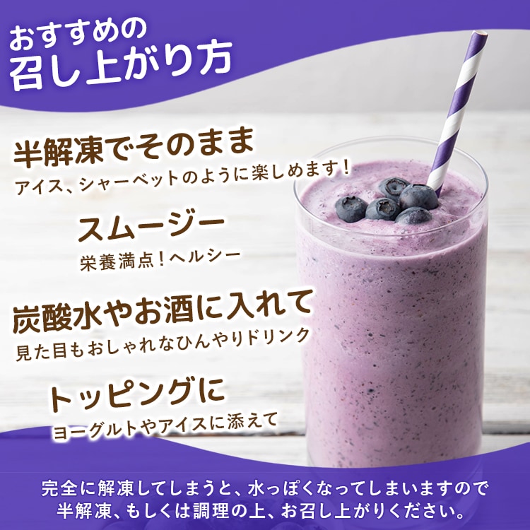| 国産ブルーベリーを急速冷凍。美味しさを閉じ込めました。 便利な100g小分けパックでお届けします。 ※完全に解凍してしまうと、水っぽくなってしまいますので 半解凍、もしくは調理の上、お召し上がりください。 <商品詳細> 【名称】冷凍果実 【原材料】ブルーベリー(国産) 【内容量】100g×10 【保存方法】冷凍(ー18℃以下で保存) 【賞味期限】商品記載(※ご家庭用の冷凍庫の場合、2か月を目安にお早目にお召し上がり下さい。) 【喫食方法】冷蔵解凍30分~1時間でお召し上がりいただけます。 【取り扱い注意点】 ・再凍結は品質劣化のもとになります。 ・解凍後は使い切ってください。 ・開封後は徐々に変色します。 ・開封後、なるべく早くお使いください。 |