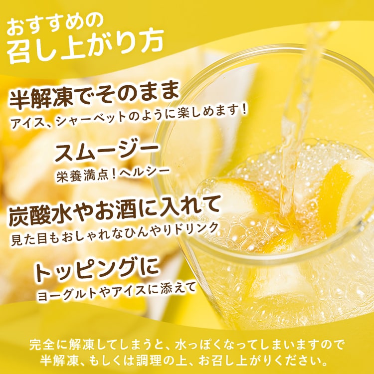 | 国産レモンを急速冷凍。美味しさを閉じ込めました。 便利な100g小分けパックでお届けします。 ※完全に解凍してしまうと、水っぽくなってしまいますので 半解凍、もしくは調理の上、お召し上がりください。 <商品詳細> 【名称】冷凍果実 【原材料】レモン(国産) 【内容量】100g×10 【保存方法】冷凍(ー18℃以下で保存) 【賞味期限】商品記載(※ご家庭用の冷凍庫の場合、2か月を目安にお早目にお召し上がり下さい。) 【喫食方法】冷蔵解凍30分~1時間でお召し上がりいただけます。 【取り扱い注意点】 ・再凍結は品質劣化のもとになります。 ・解凍後は使い切ってください。 ・開封後は徐々に変色します。 ・開封後、なるべく早くお使いください。 |