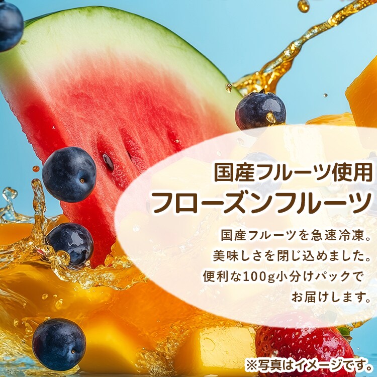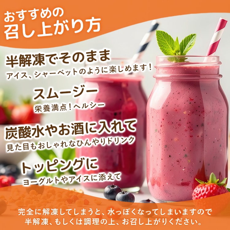 | 国産フルーツを急速冷凍。美味しさを閉じ込めました。 便利な100g小分けパックでお届けします。 ※完全に解凍してしまうと、水っぽくなってしまいますので 半解凍、もしくは調理の上、お召し上がりください。 <商品詳細> 【名称】冷凍果実 【保存方法】冷凍(ー18℃以下で保存) 【賞味期限】商品記載(※ご家庭用の冷凍庫の場合、2か月を目安にお早目にお召し上がり下さい。) 【喫食方法】冷蔵解凍30分~1時間でお召し上がりいただけます。 【取り扱い注意点】 ・再凍結は品質劣化のもとになります。 ・解凍後は使い切ってください。 ・開封後は徐々に変色します。 ・開封後、なるべく早くお使いください。 〇すいか 【原材料】スイカ(国産) 【内容量】100g×2 〇パイナップル 【原材料】パイン(国産) 【内容量】100g×2 〇白桃 【原材料】もも(国産)/酸化防止剤(ビタミンC) 【アレルギー28品目】もも 【内容量】100g×2 〇メロン 【原材料】メロン(国産) 【アレルギー28品目】メロン 【内容量】100g×2 〇いちご 【原材料】いちご(国産) 【内容量】100g×2 |