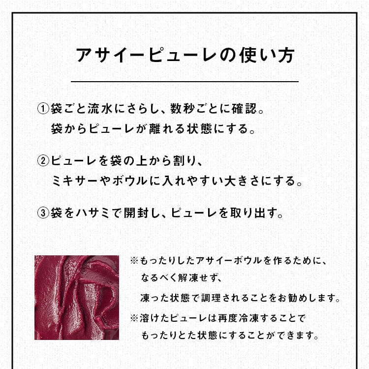 | 全国展開の大人気アサイーボウル専門店@atmarkから冷凍ピューレが登場! 厳選した素材をバランスよくブレンドしたこだわりのオリジナルピューレです。 豆乳を少し加えてミキサーにかけるだけで お店と同じ味わいの、もったりアサイーボウルが完成します。 冷凍庫にストックしておけば、朝食や小腹がすいた時に大活躍。 砂糖・保存料不使用で、 毎日でも安心してお召し上がりいただけます。 <商品詳細> 【名称】冷凍アサイーピューレ 【原材料】アサイーピューレ(ブラジル産)、バナナ、マンゴー、ミックスベリー、無糖ヨーグルト 【添加物】クエン酸、安定剤(ペクチン)、香料 【アレルギー28品目】バナナ、乳成分、ゼラチン 【遺伝子組み換えの有無】無し 【商品説明】アサイーや各種果物をミキサーにかけ、攪拌し急速冷凍致しました。 【内容量】150g×3袋 【保存方法】要冷凍(ー18℃以下) 【賞味期限】商品記載(※ご家庭用の冷凍庫の場合、2か月を目安にお早目にお召し上がり下さい。) 【喫食方法】冷蔵もしくは流水解凍し、半解凍させ、お好きな果物やナッツをトッピングし、お召し上がりください。 【取り扱い注意点】 再凍結は品質劣化のもとになります。解凍後は使い切ってください。 ※開封後、なるべく早くお使いください。 |
