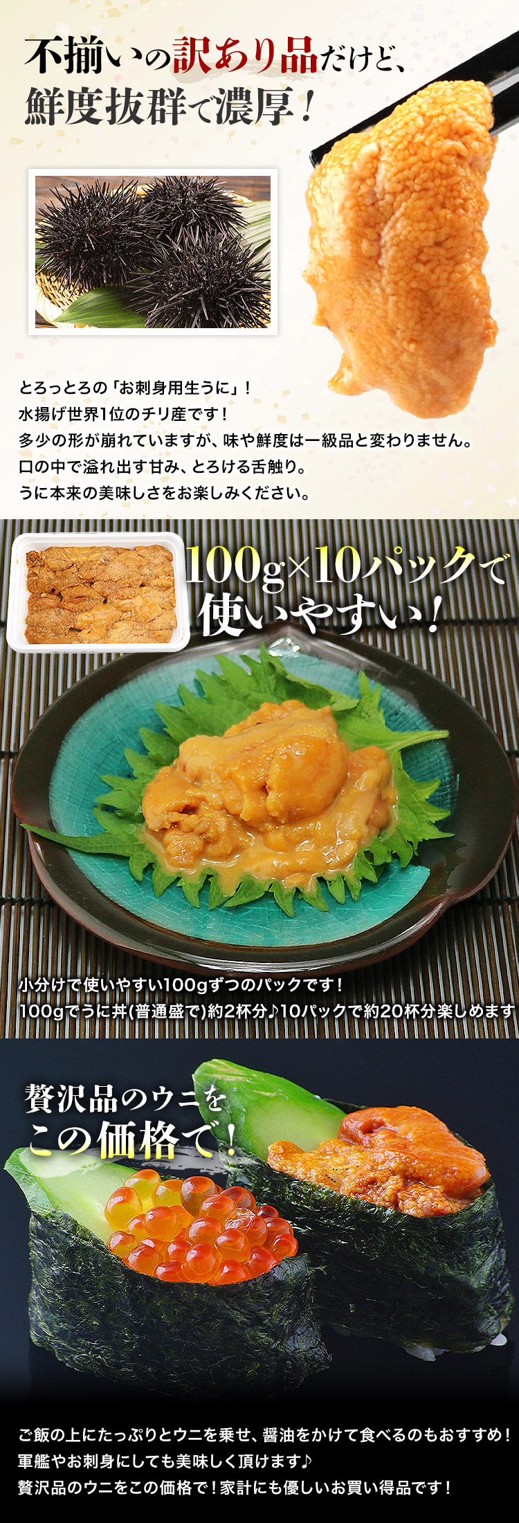 うに 100g×10パック 訳あり 冷凍 不揃い 崩れ お刺身 ウニ うに 雲丹 冷凍 グルメ 食品 海鮮<年末指定可>