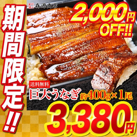 巨大 うなぎ蒲焼 400g前後×1本 送料無料 山椒 鰻たれ付 お取り寄せグルメ 食品 ギフト 海鮮 衝撃価格 お祝い 土用丑【最安値に挑戦!5380円→2000円OFF★3380円セール】<年末指定可>