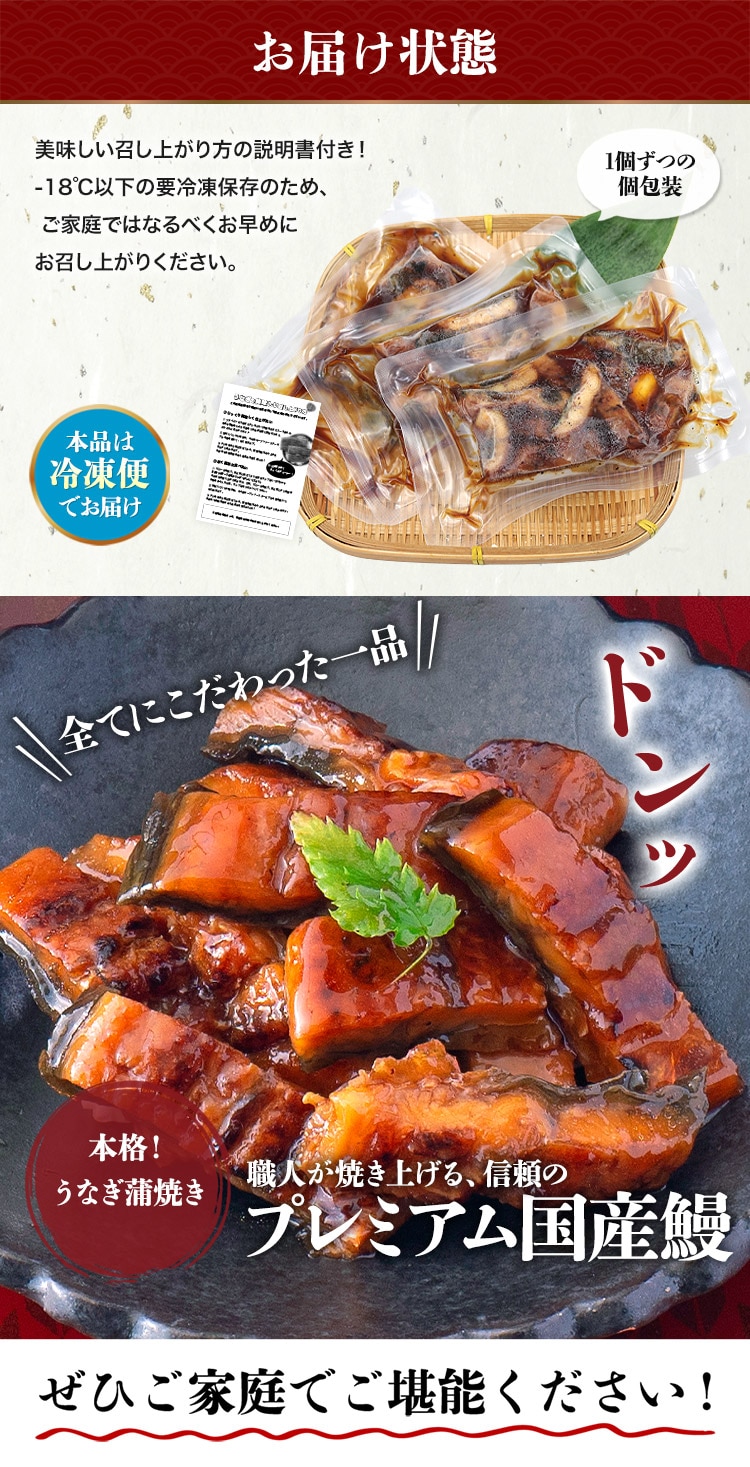 うなぎ(鹿児島県)、しょうゆ(大豆・小麦を含む)、砂糖、みりん、水あめ、発酵調味料