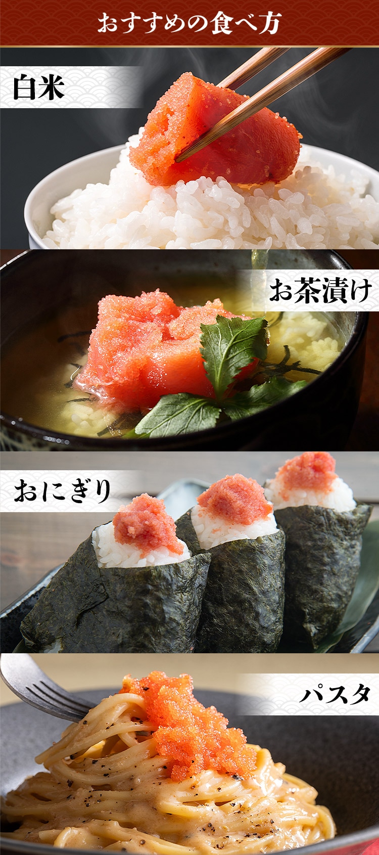 また、着色料を使用しておらず、明太子本来の見た目・味をお楽しみいただけます!