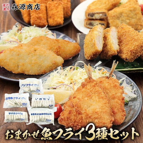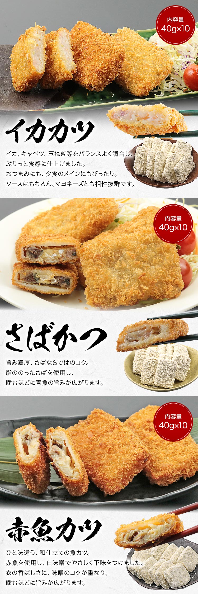 あじフライ、白身フライ、イカカツ、さばカツ、赤魚カツのいずれか3種をお届けします。