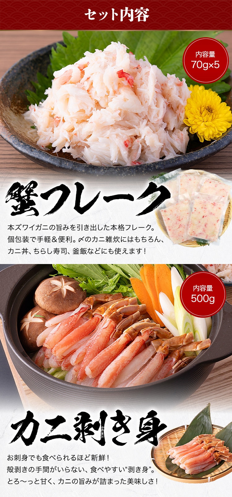 \5日限定!ポイント最大39倍/カニ鍋セット 本ズワイガニ ポーション 500g フレーク 70g×5 ずわい蟹 かに カニ 剥き身<年末指定可>