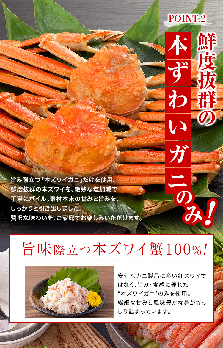 本ズワイガニならではの旨味と食べやすくした身を思う存分ご堪能いただけます