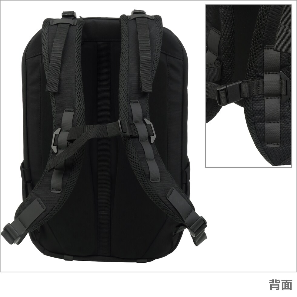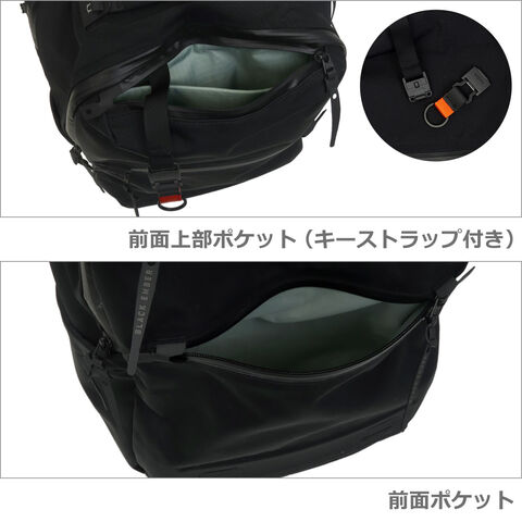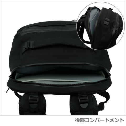 ・前面ポケット(ファスナー開閉) ・前面上部ポケット(ファスナー開閉 / オープンポケット×1 / キーストラップ(取り外し可)×1) ・メインコンパートメント (ダブルファスナー開閉 / オープンポケット×1、ジップメッシュポケット×1、ジップポケット×1) ・両サイドにボトルポケットを装備 ・後部コンパートメント(PC用コンパートメント) (ダブルファスナー開閉 / タブレットスリーブ×1) ・トップハンドル ・背面には他のキャリーにセットアップ可能なストラップを装備 ・長さ調節可能なショルダーハーネス(ロードリフトストラップ、上下の位置調節可能なチェストストラップ付き) |