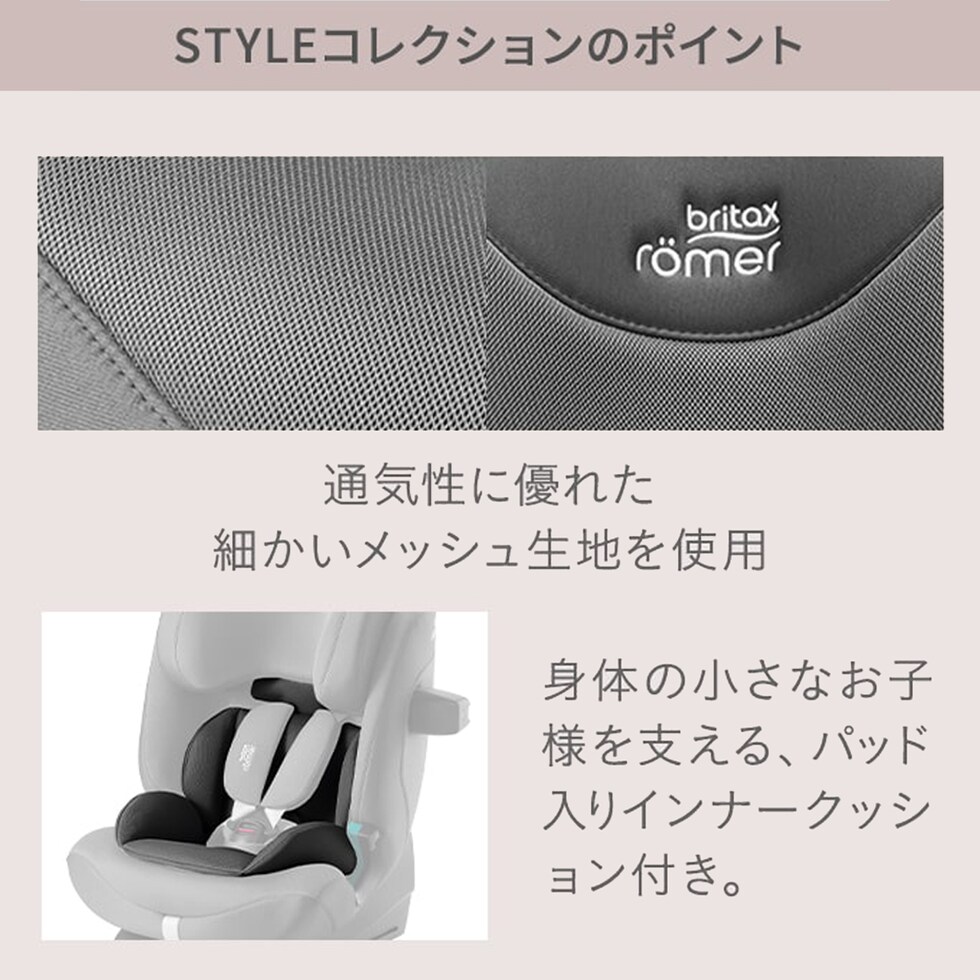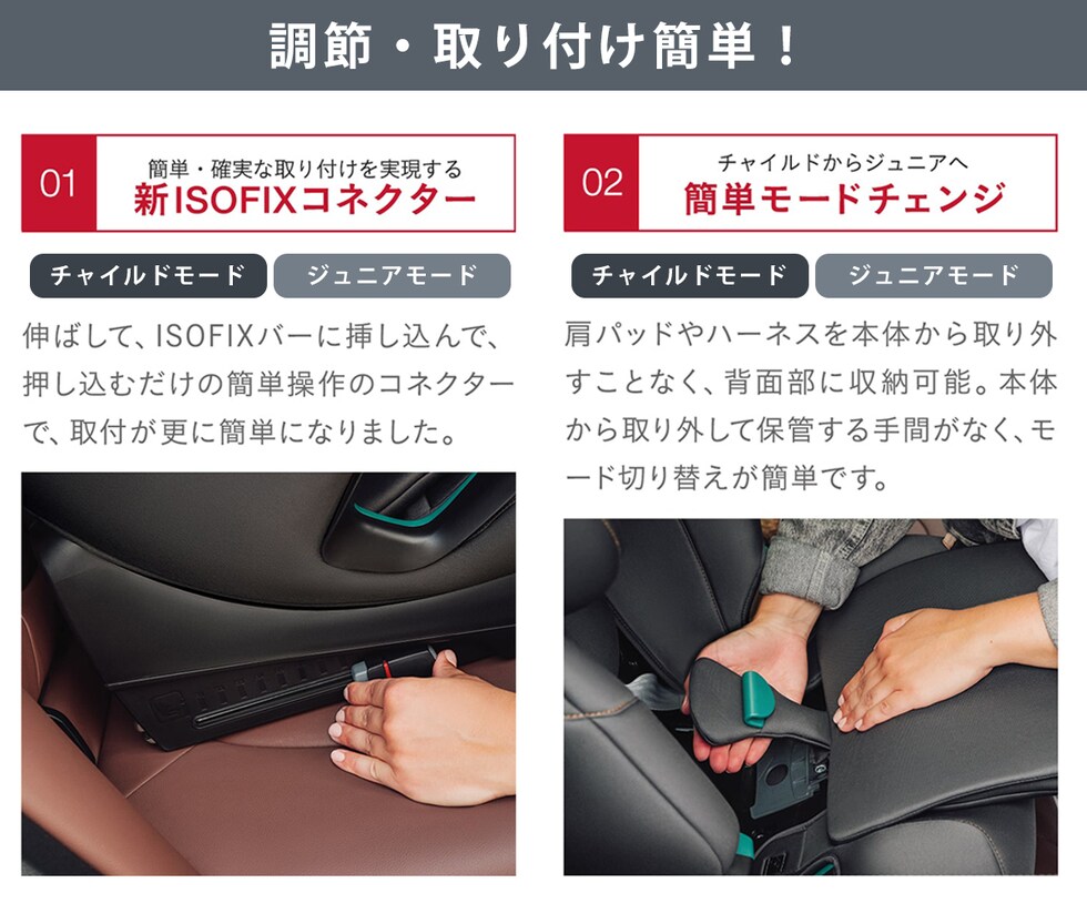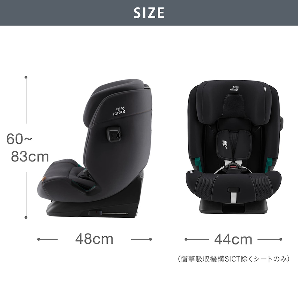 | ・身長76~105cm(体重22kgまで):ISOFIX固定+トップテザー ・身長100cm~150cm:ISOFIX固定+シートベルト、またはシートベルトのみ |