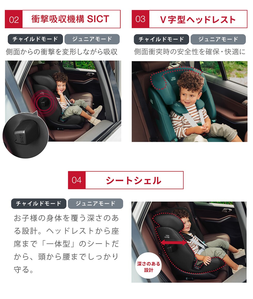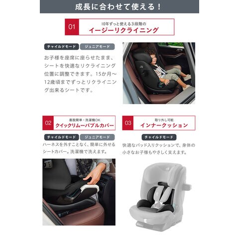 ・車のシートを傷つけることなく素早く安全に接続できる、独立した操作が可能なISOFIXコネクター ・頑丈なトップテザーが事故時のチャイルドシートの揺れを最小限に抑え、お子さまの頭や首にダメージを負う可能性を低減します ・側面衝突から大切なお子さまを守るサイド・インパクト・クッション・テクノロジー(SICT) ・快適で保護性の高いヘッドレスト ・お子さまの成長に合わせて内蔵の5点式ハーネスを車の3点式シートベルトに簡単に交換が可能 ・洗濯できるシートカバー付き |