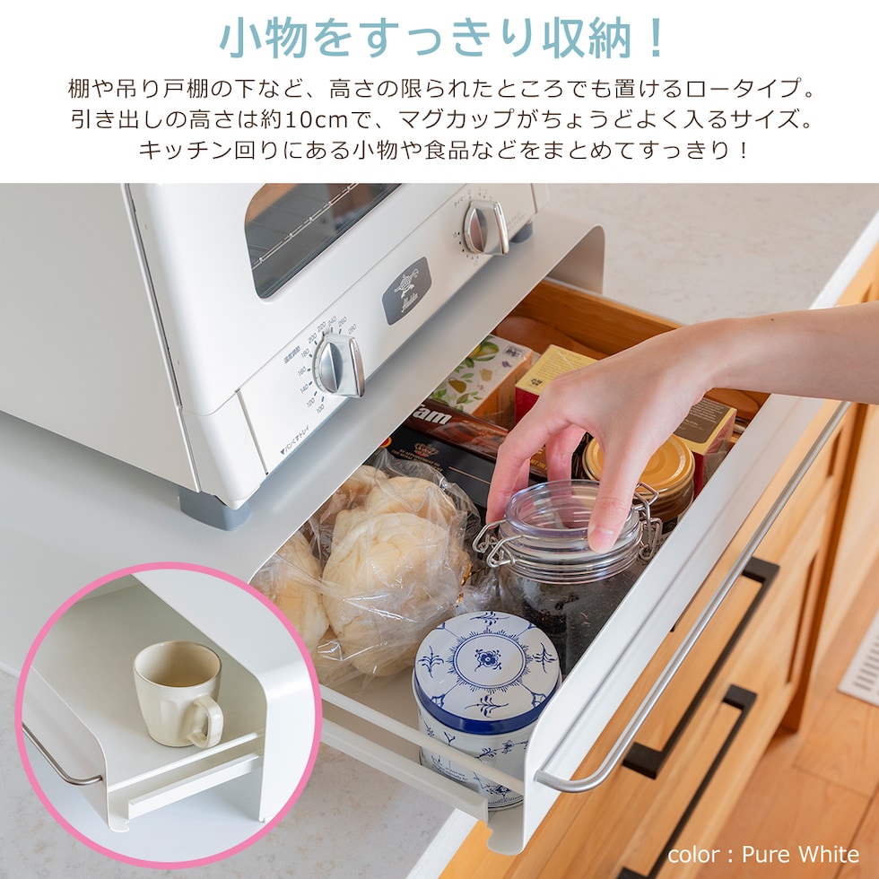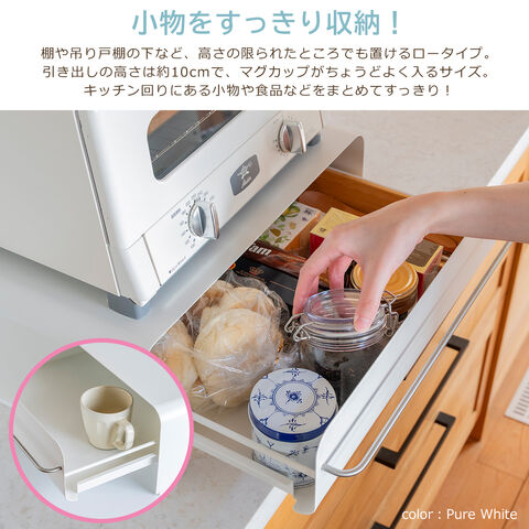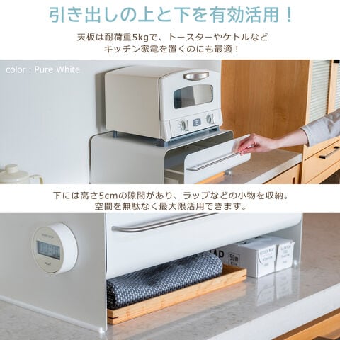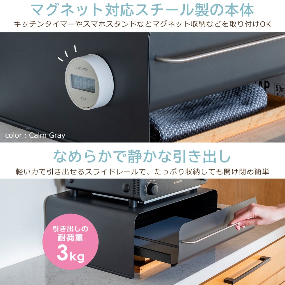 ・用途やスペースに合わせて選べるタイプ別のドロワー ・おしゃれ×機能性で、小物が増えがちなキッチン周りをスッキリ収納 ・食パンやコーヒー、お菓子などをまとめて収納できる大容量 ・スムーズに引き出せるローラー付きレールの引き出しは、開けた時に中身が見渡せて奥の物も取りやすいです ・音を軽減するフェルト製クッションが貼ってあるので、金属のぶつかる音を軽減し、静かに引き出しを閉めることができます ・本体はマグネット対応なのでキッチンタイマーやマグネット式のフックなどつけておいても便利 ・引き出し底板の傷付きを防ぎ、中身の滑り止めにもなるクッションシートと、設置場所を保護するクッションゴム付き ・ブレッドドロワー(スリム / ワイド)は2021年度 グッドデザイン賞を受賞 |
