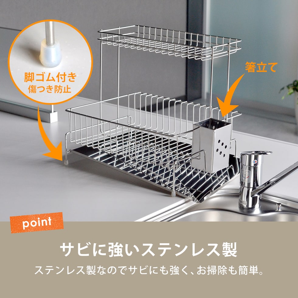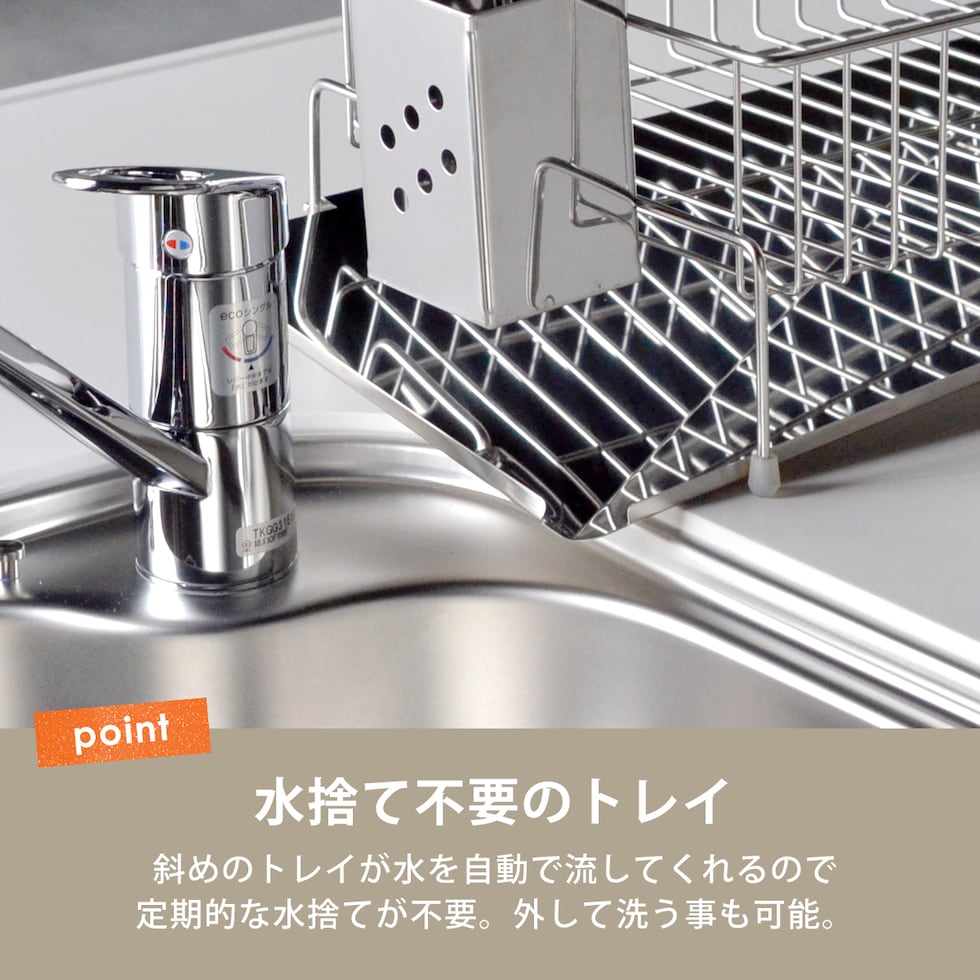 ・ステンレス製「斜めに流れる水切り」の2段タイプ ・キッチンのレイアウトに合わせて選べる右置き・左置きの2タイプ ・傾斜のついたトレイが水を流してくれるので水捨て不要 ・ステンレス製なのでサビにも強くお掃除もラクラク ・外して洗えるトレイでいつでも清潔 ・カトラリーホルダー(箸立て)は取り外し可能 |