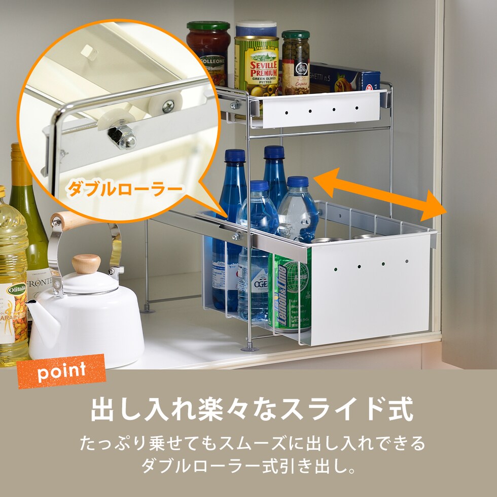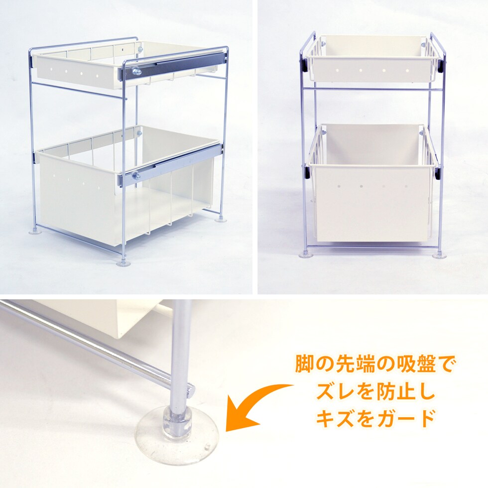 ・シンクの下や洗面台の下等、収納に便利なスペースを有効活用 ・スライド式の引き出しで出し入れラクラク ・頑丈かつスムーズに動くダブルローラー式の引き出し ・湿気の多い場所にもおすすめな防サビ加工 ・物が落ちにくいフラットな形状の棚板 ・脚の先端に吸盤をセットすることでズレを防止し、キズから守ります |
