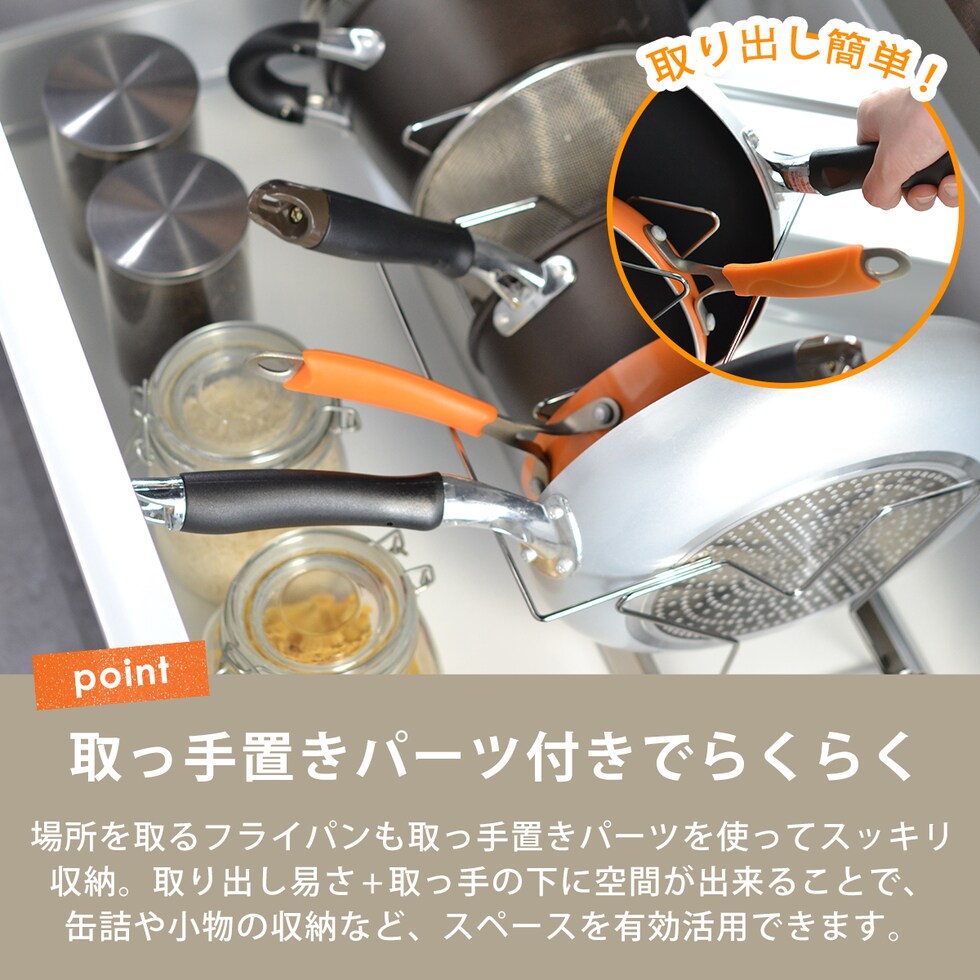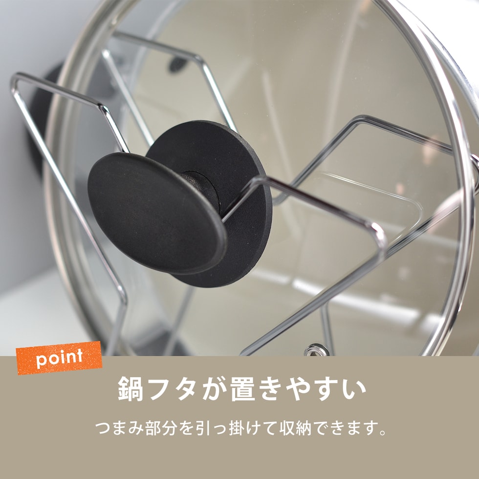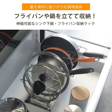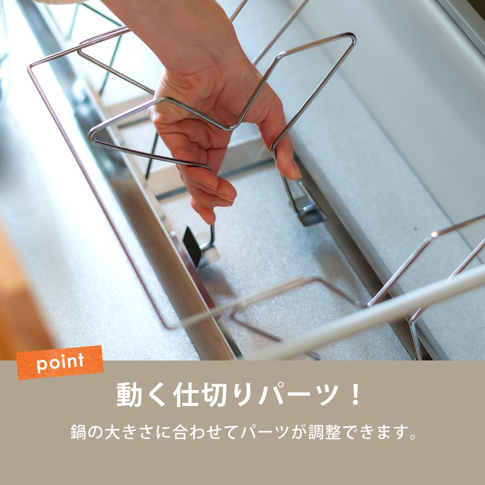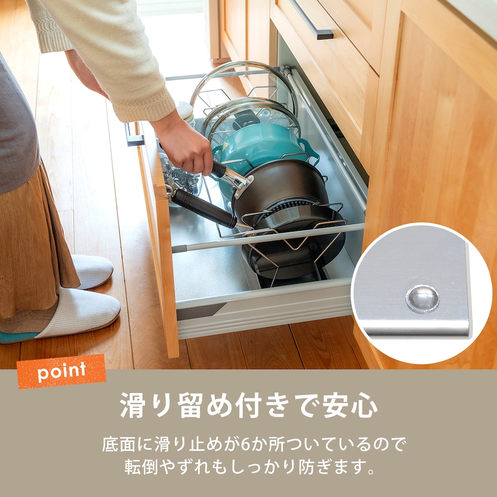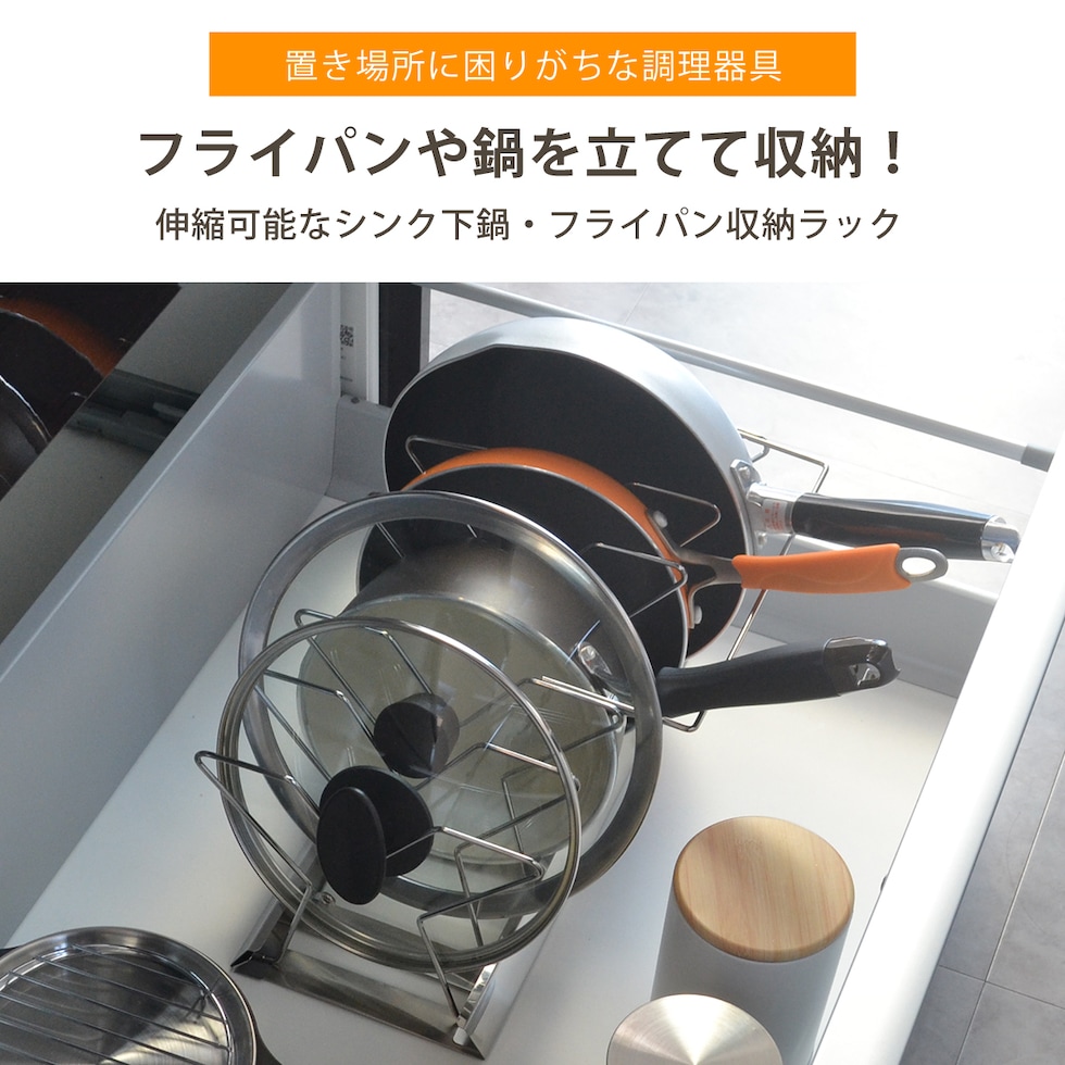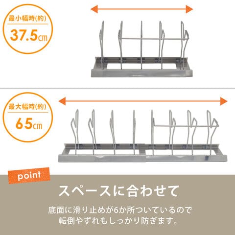 ・鍋やフタ、フライパン等をシンク下などの限られたスペースに収納できるラック ・出し入れしやすいように鍋類を立てて収納が可能 ・収納スペースに合わせて簡単にサイズを調節(約37.5cm~65cmの間) ・仕切りパーツは、自由な間隔で設置可能 ・取って置き付きで、フライパンや鍋が取り出しやすい構造 ・取って置き下の空いたスペースは小物のストックスペースとしても ・転倒やズレもしっかり防ぐ滑り止め付き |