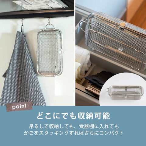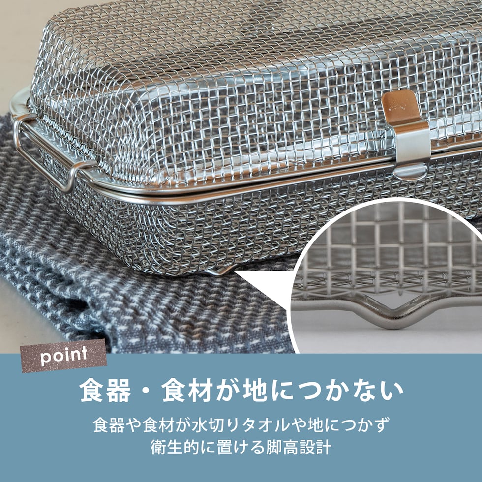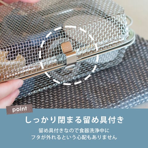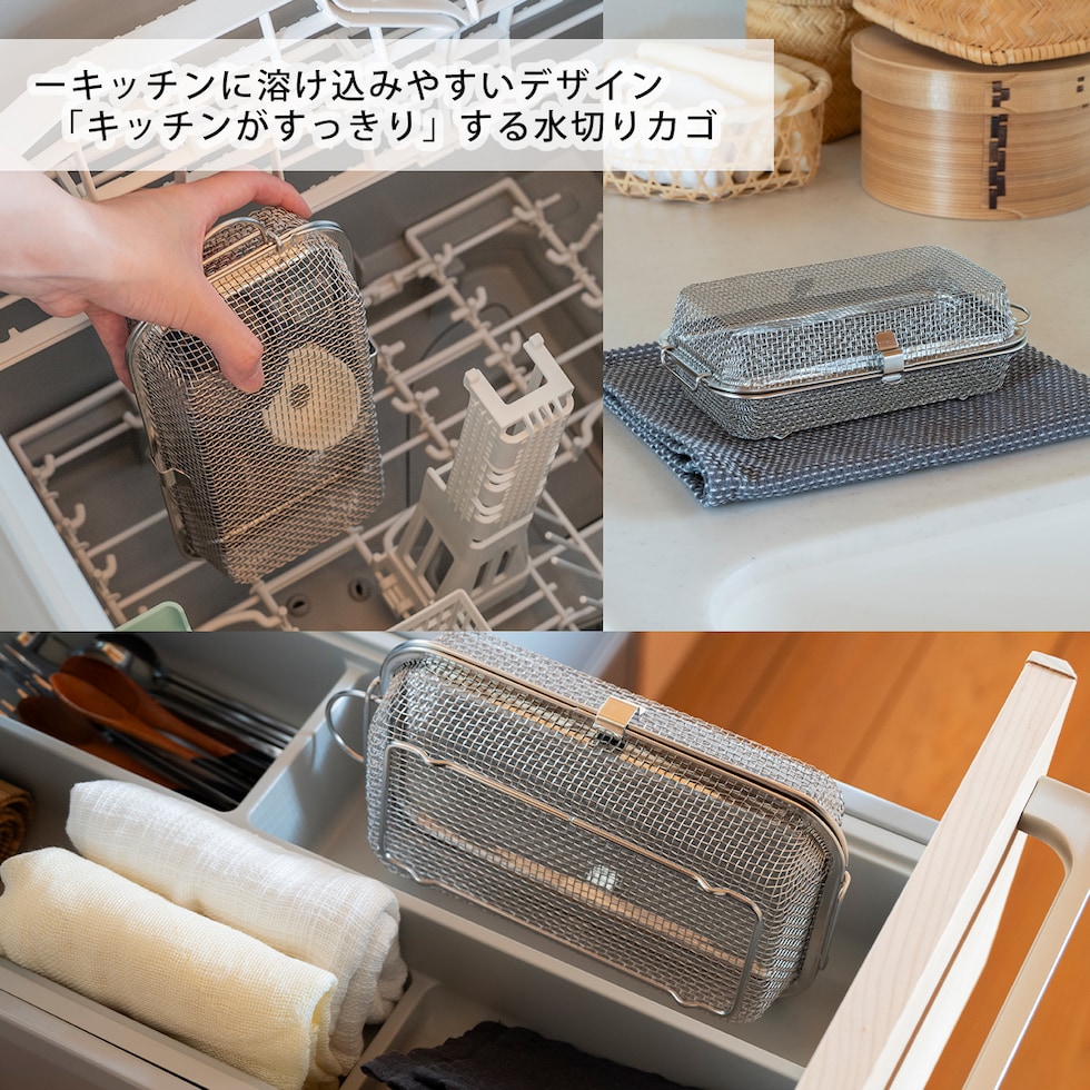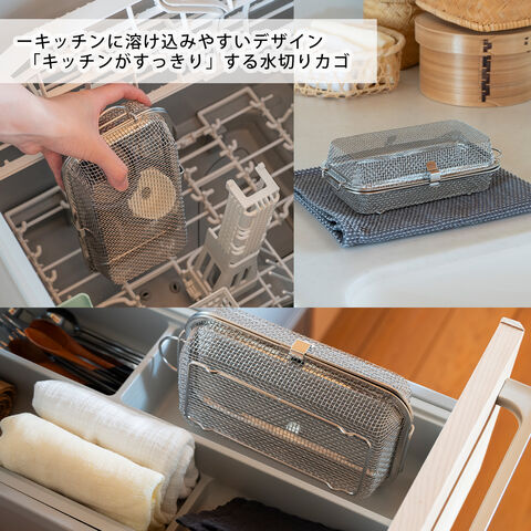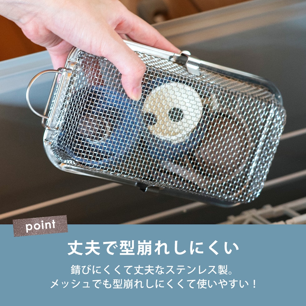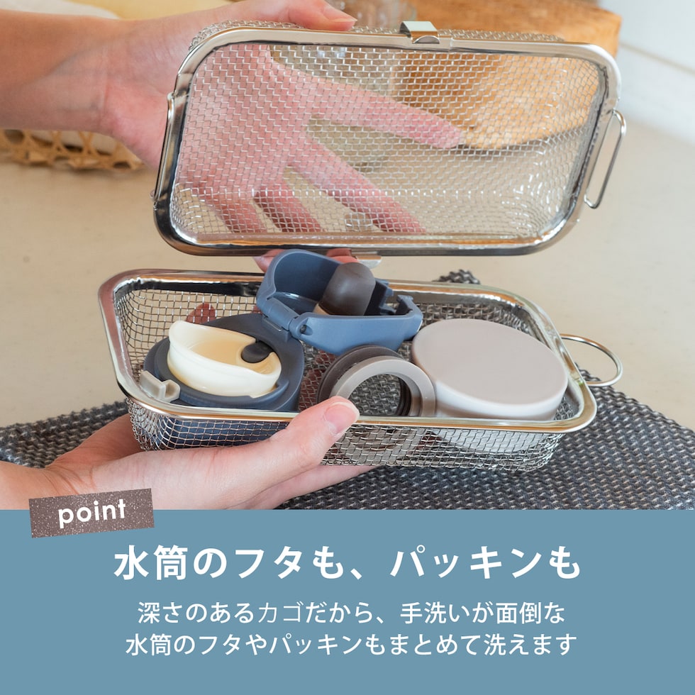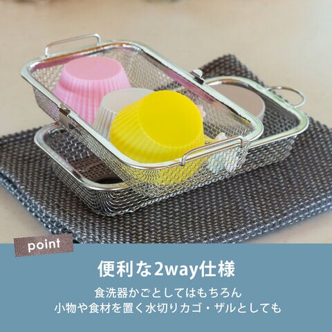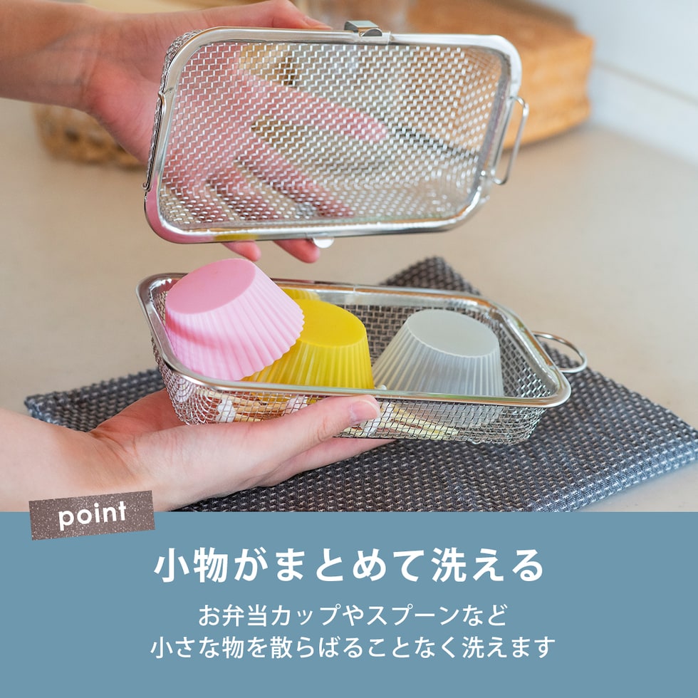 ・手洗いしにくいお弁当用のカップやピックをまとめて食洗機へ ・水筒のフタも入る深めのサイズ(※高さ5cm程度推奨) ・収納に困らないコンパクトサイズ ・燕三条の丈夫でサビ強い18-8ステンレス製 ・脚高なので直接小物や食材が地につかないから衛生的 ・小物や食材の水切りかご・ザルとしても使用可能 |
