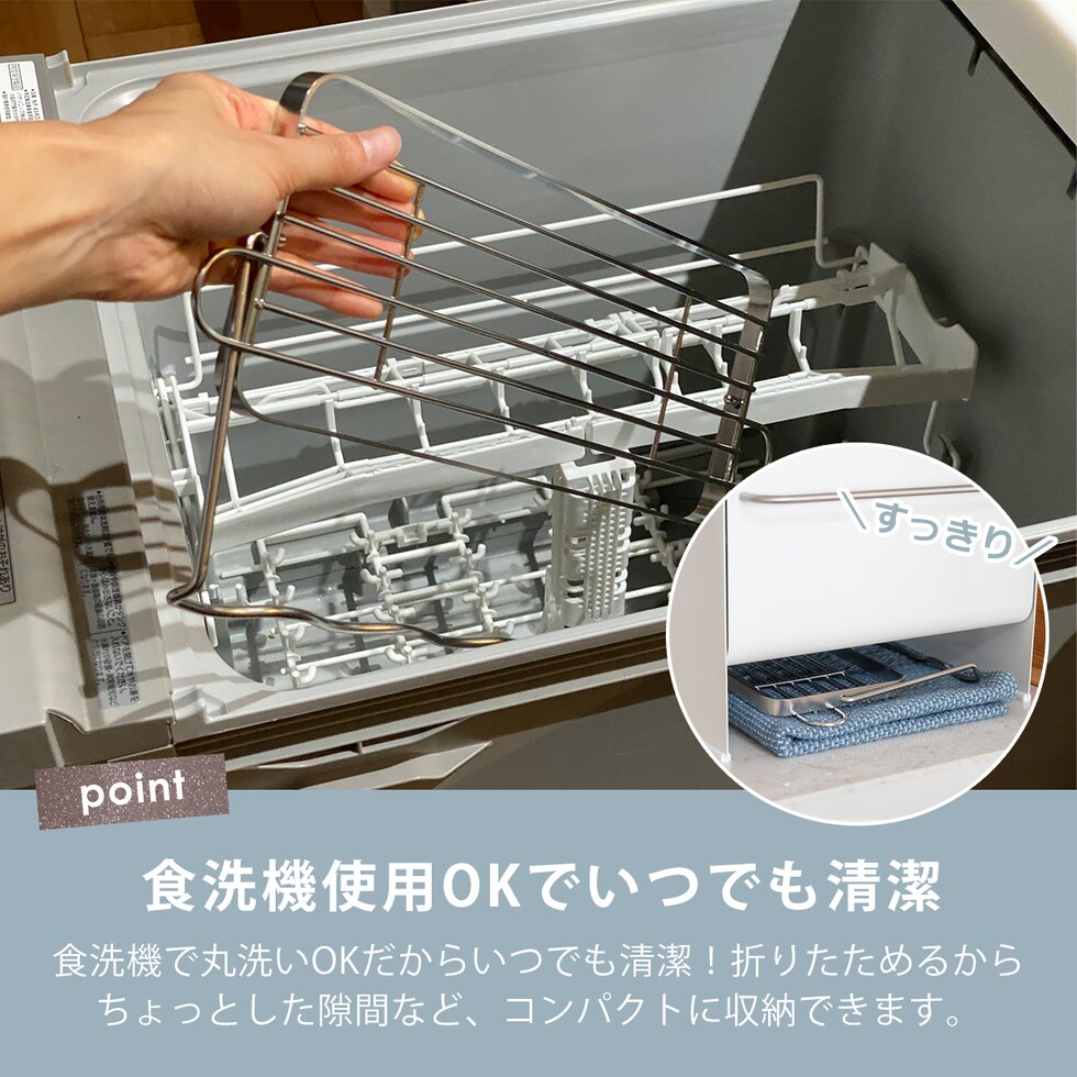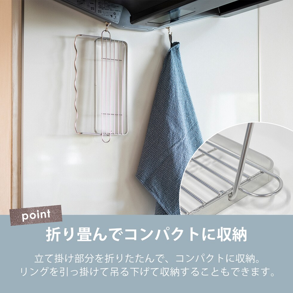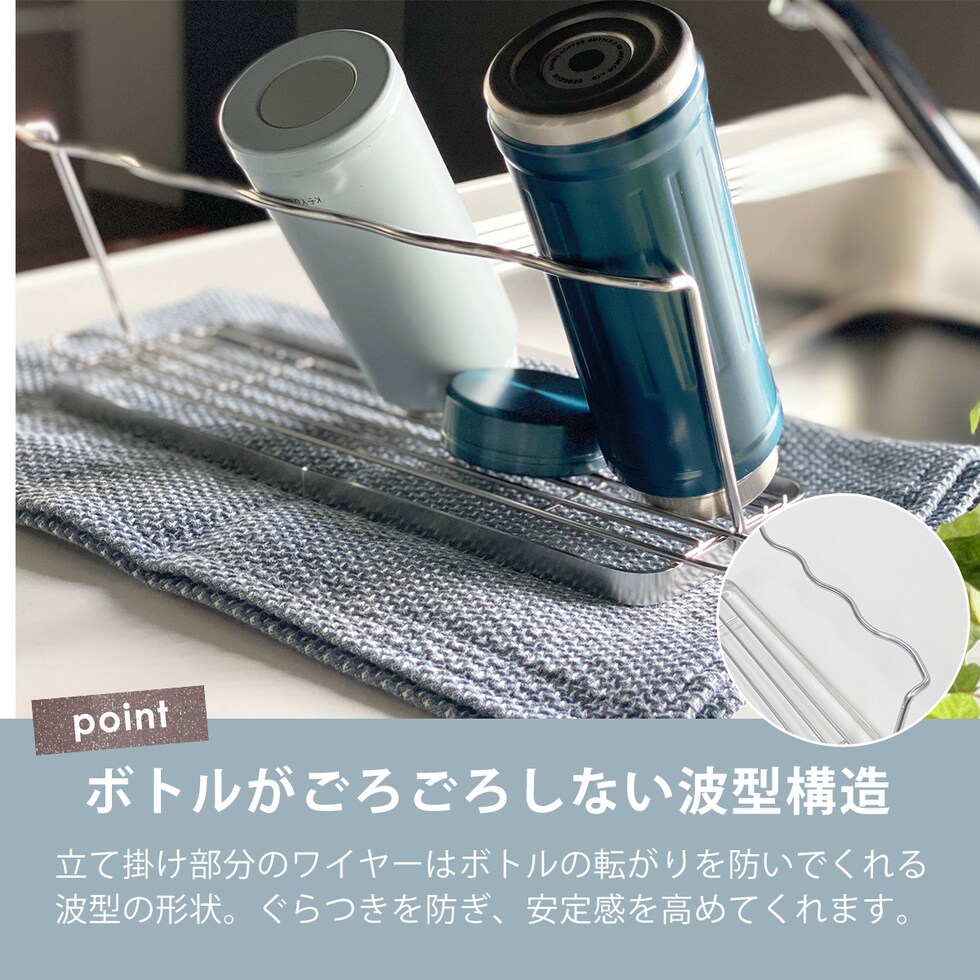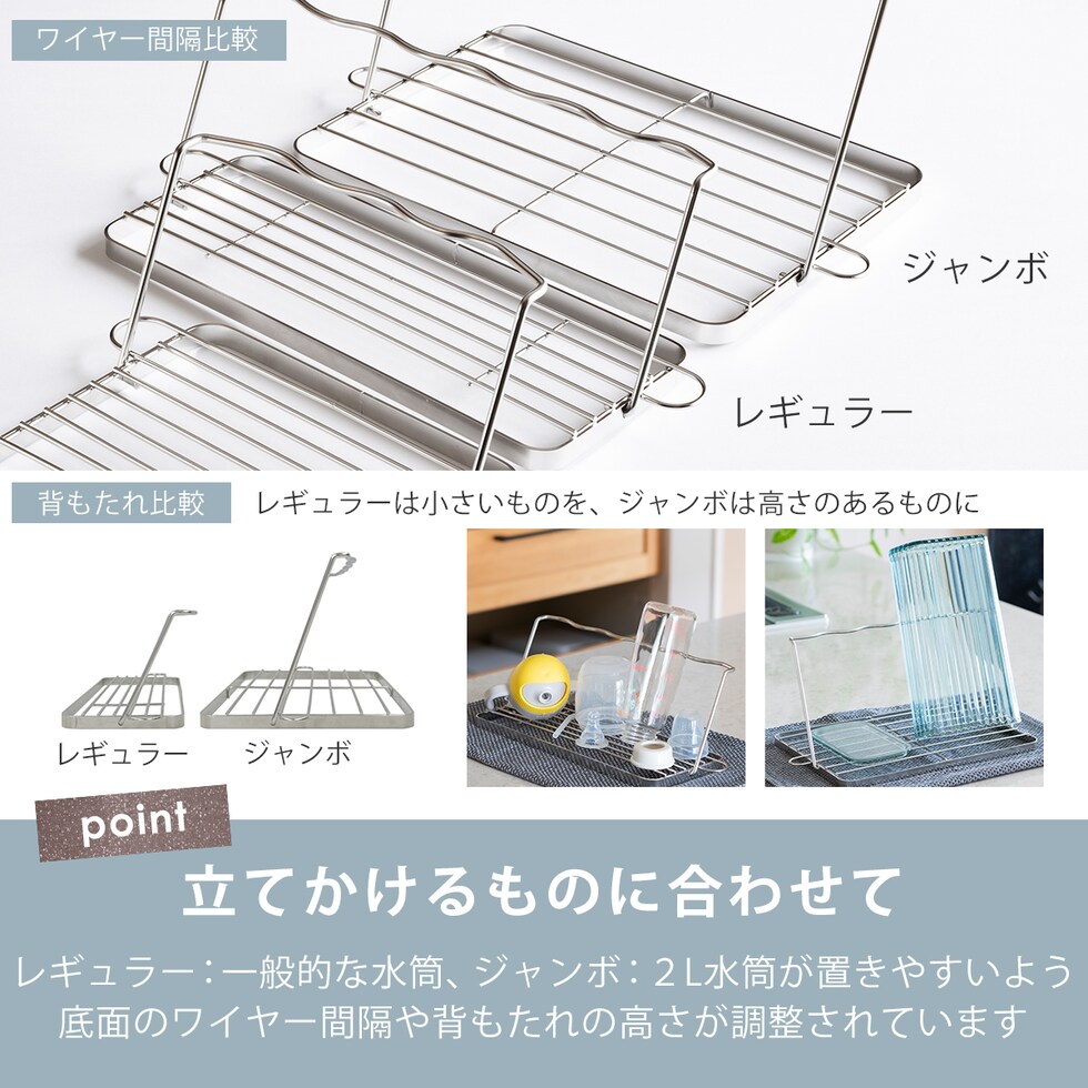 | ・折りたためてコンパクトに収納できるジャグボトルスタンド ・背もたれの波型ワイヤーがボトルにフィットし、横倒れを防止 ・水筒だけでなく、調理器具の水切りにも便利 ・引っかけて収納可能で置き場所を取らない |