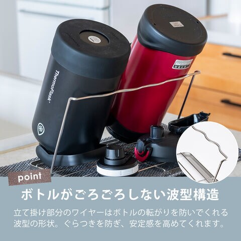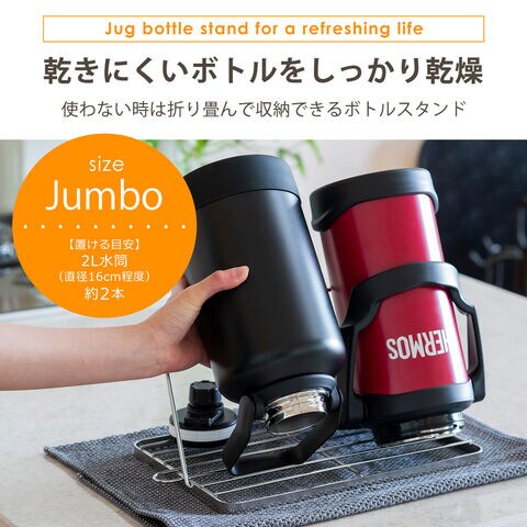 | ・折りたためてコンパクトに収納できるジャグボトルスタンド ・2L(直径16cm程度)の水筒2本とキャップやパッキンを一緒に乾かすことができる ・背もたれの波型ワイヤーがボトルにフィットし、横倒れを防止 ・ワンタッチで折りたたみ可能 ・水筒だけでなく、調理器具の水切りにも便利 ・引っかけて収納可能で置き場所を取らない |