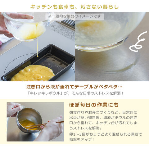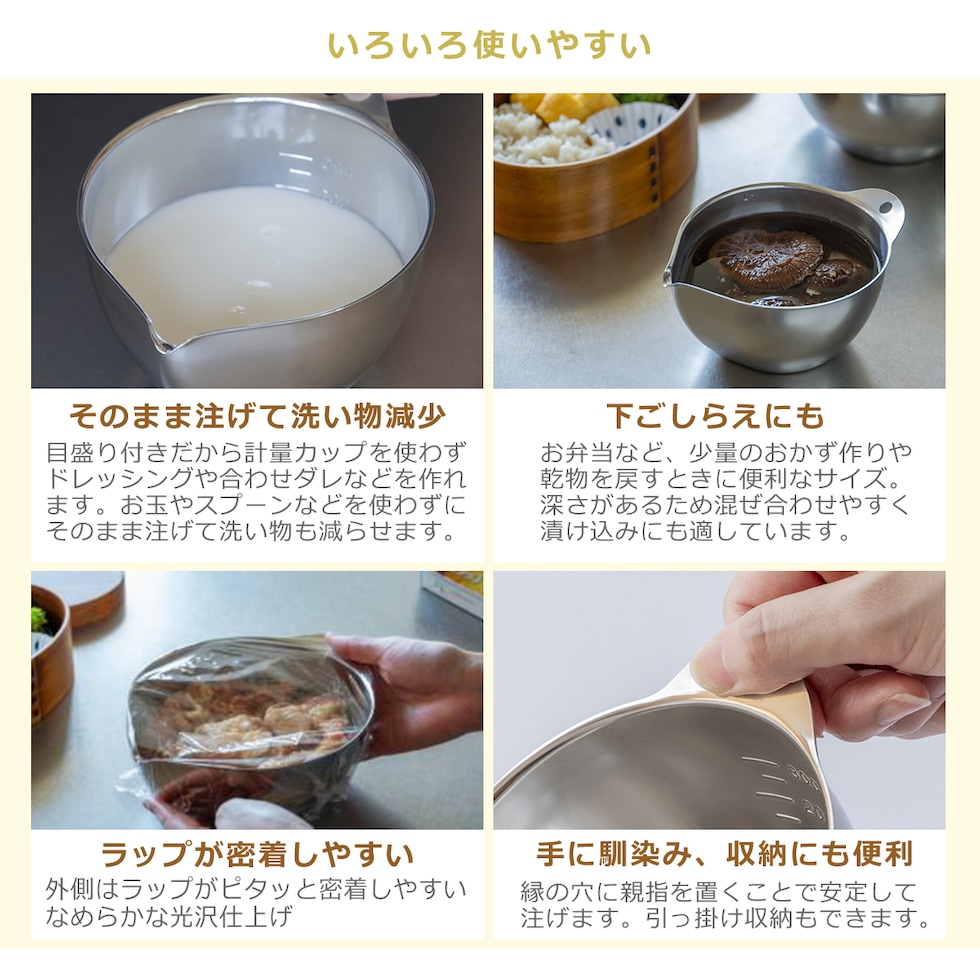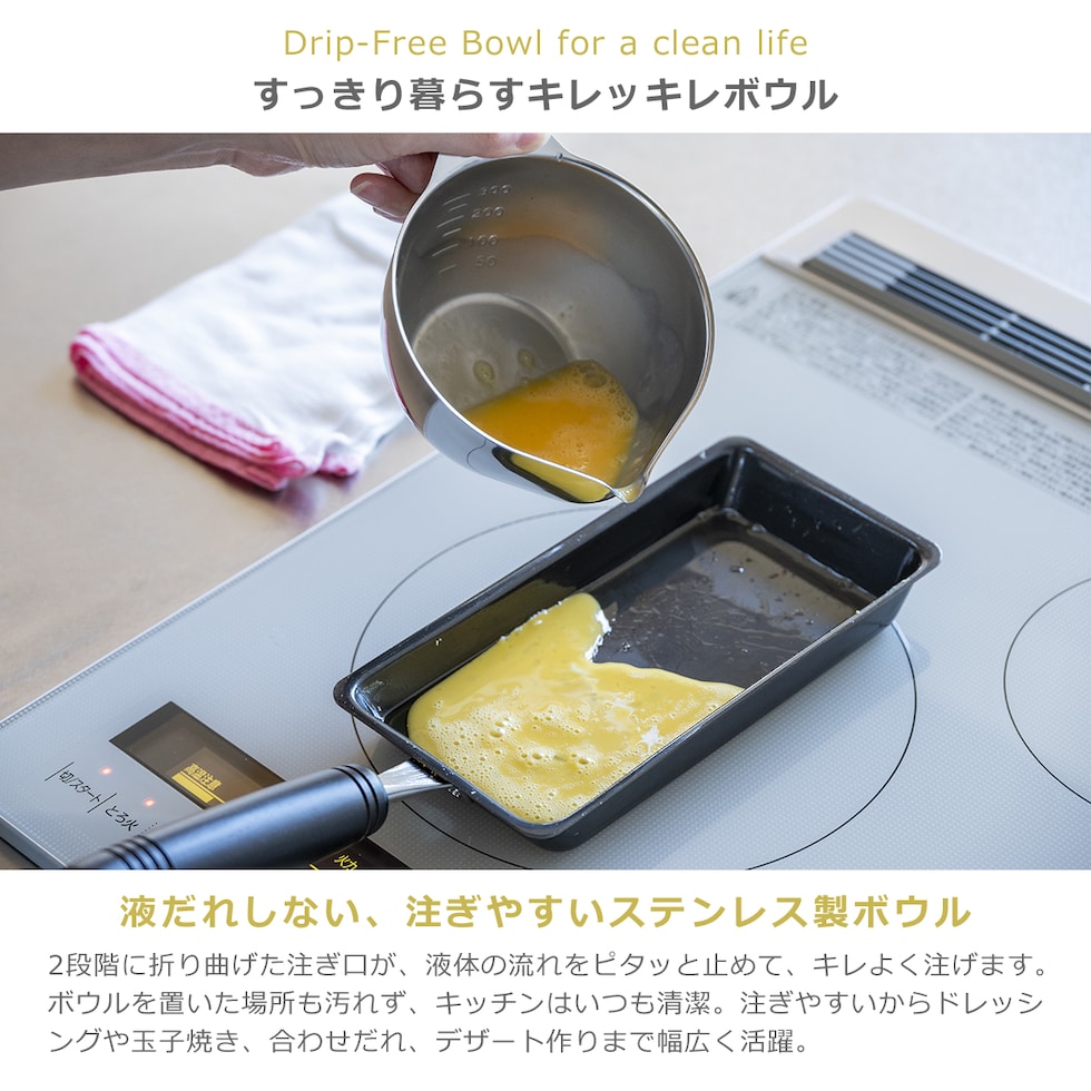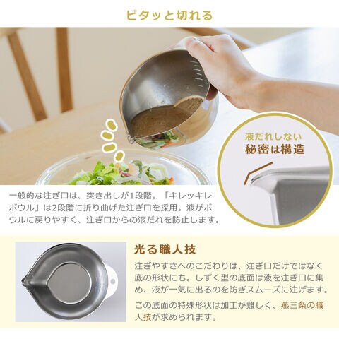 ・液体が垂れずにピタッと切れるステンレス製のボウル ・注ぎ口の突き出しを2段階にすることで液だれを防ぎます ・液体がボウルの注ぎ口から垂れて、置いたところが汚れてしまったという日頃の煩わしさを解消します ・燕三条の職人技により作られる雫型の底面が液体を注ぎ口に集中させ、液体が一気に出るのを防ぎスムーズに注げます ・持ちやすさにこだわった緩やかなカーブのフチが、手にしっくりと馴染みます ・持ち手に穴があることで親指がフィットし、ボウルをしっかり支えられます ・引っ掛け収納可能 ・外側はラップがぴたっと密着する、なめらかな光沢仕上げ |
