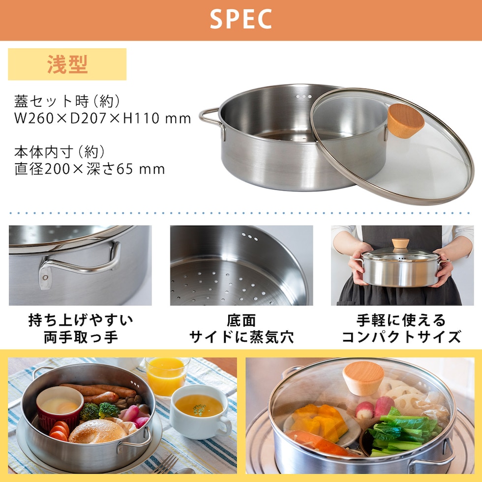 【本体・ガラス蓋】 ・蒸し料理が手持ちの鍋やフライパンで出来るお手入れ簡単なステンレス製せいろ ・竹製のせいろと違い、ステンレス製だからカビの心配不要 ・中の様子がわかりやすいガラス蓋付き |