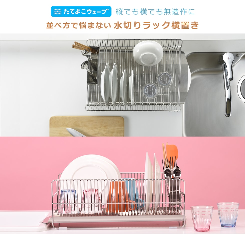 ・縦にも横にもお皿が立つ『たてよこウェーブ』搭載の水切りカゴ ・お皿をやさしく受けとめる、鳥が羽を広げているようなデザインのスワンウィング ・取り外し可能な箸立て付き ・水がきらきら流れる専用トレーで、排水の手間を省きお手入れも簡単 ・全ての端面のバリを無くし、やわらかい使い心地 ・すべりにくいゴム脚で水まわりでも安心 |