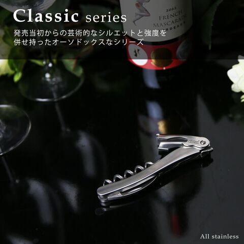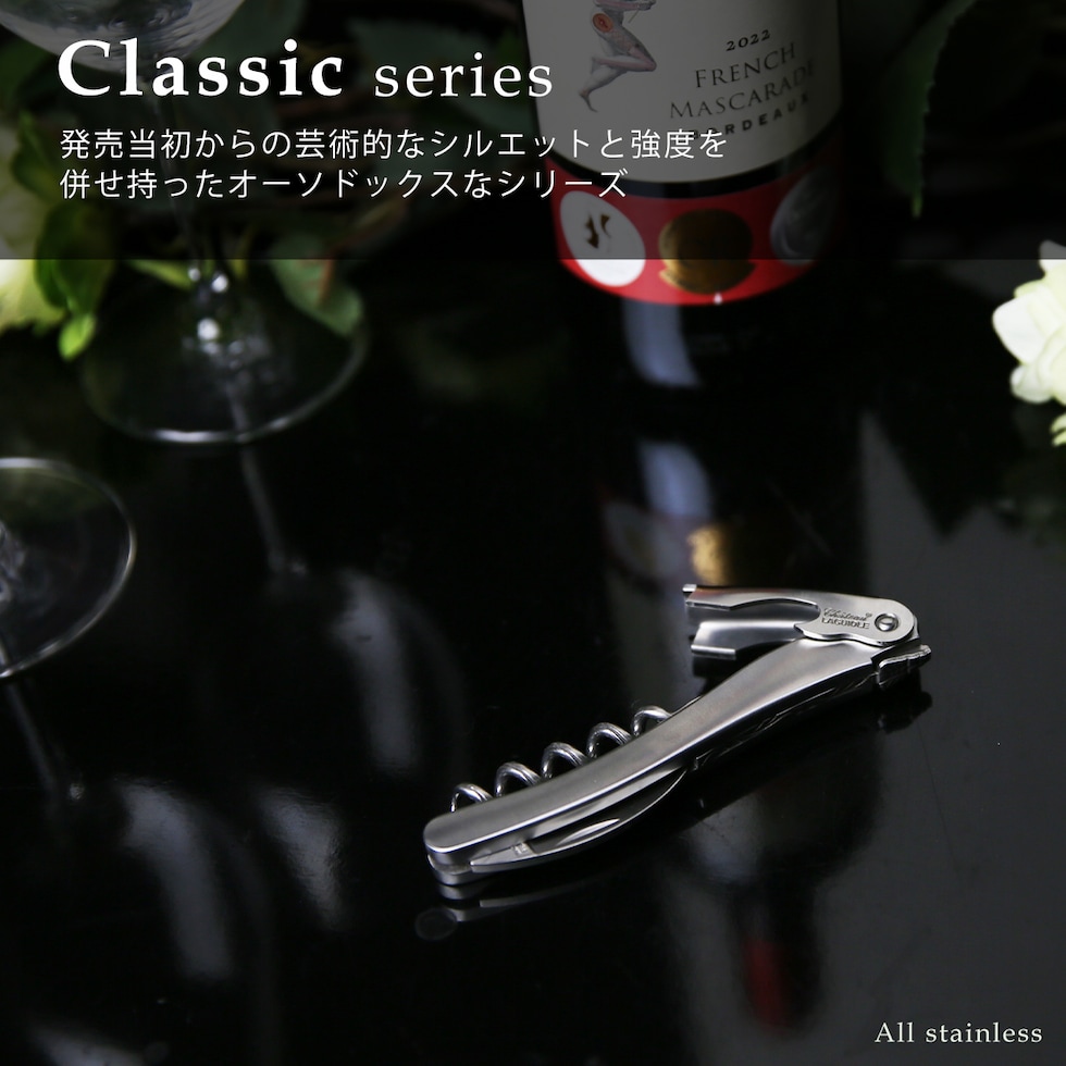 | Classic(クラシック モデル) シャトーラギオールの中でもオーソドックスなシリーズ。発売当初からの芸術的なシルエットと強度を併せ持った、入門用ソムリエナイフとしてお勧めのモデル。 |