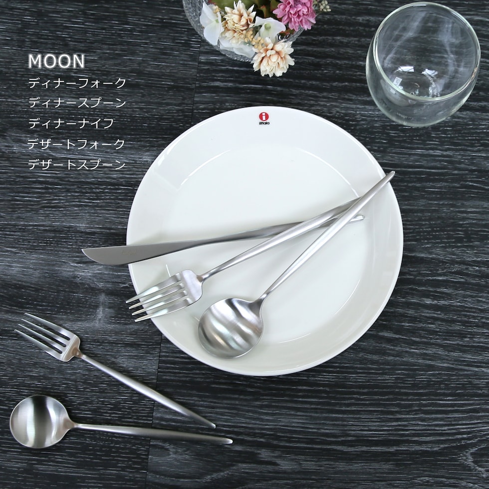 | MOON MATT (ムーンマット) 人気の高い GOA(ゴア)シリーズと同じラインのマットなカトラリー。持ち手部分もステンレス一体型になっており、丸みを持ったフォルムは繊細で、とても上品な印象です。 |