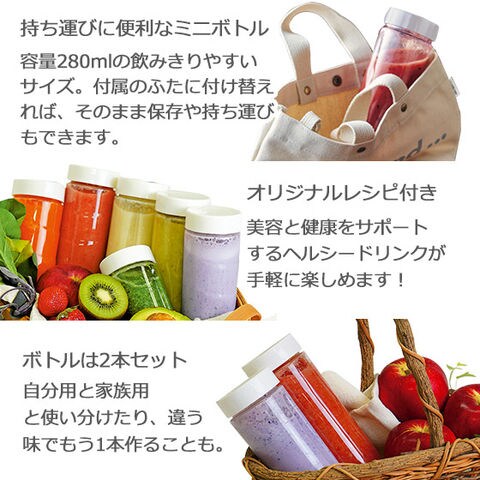 ・本体がコンパクトだから、収納場所を選びません。 ・コンセントが使える環境なら、いつでもどこでも調理が可能! ・カッターは錆に強く、耐久性に優れたチタンコーティング仕上げ。 ・ボトル2本セットなので、洗い替えや別メニュー作りなど使い勝手抜群! |