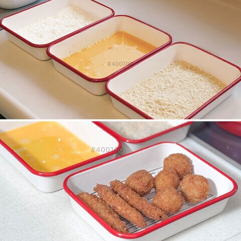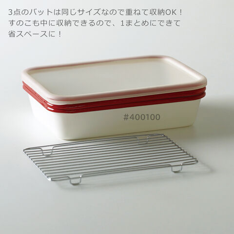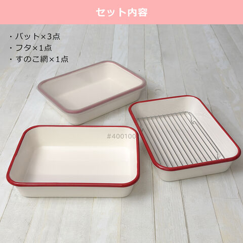 ・赤いフチがかわいらしいレトロなホーロー製のバット3枚とフタ1枚、すのこ網がセットに! ・バットは同じサイズなので重ねてすっきり収納 ・揚げ物の油切りや水洗いした野菜の水切りなどに便利なすのこ網付き ・セットのフタをすれば、保存容器に。ホーロー製なのでニオイが移りにくい |