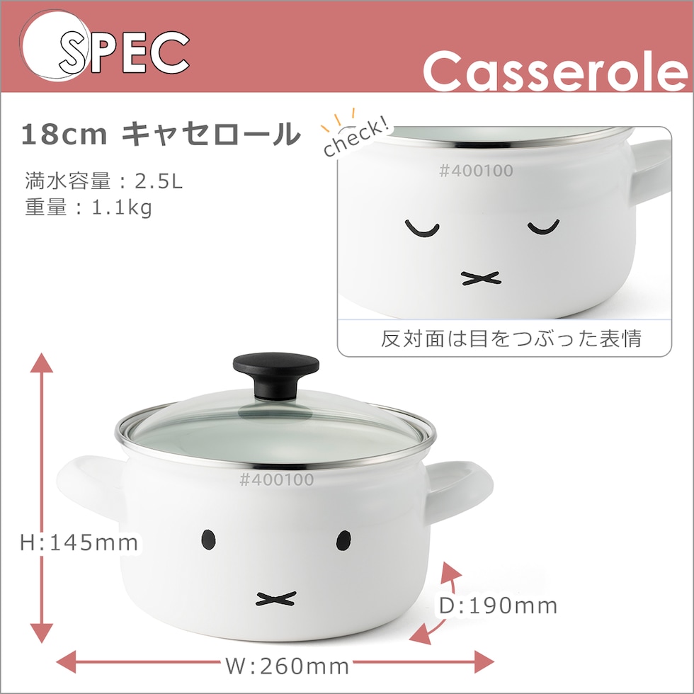 ・純白のホーローにミッフィーのお顔が描かれたチャーミングなシリーズ ・普段使いにちょうど良い18cm両手鍋 |
