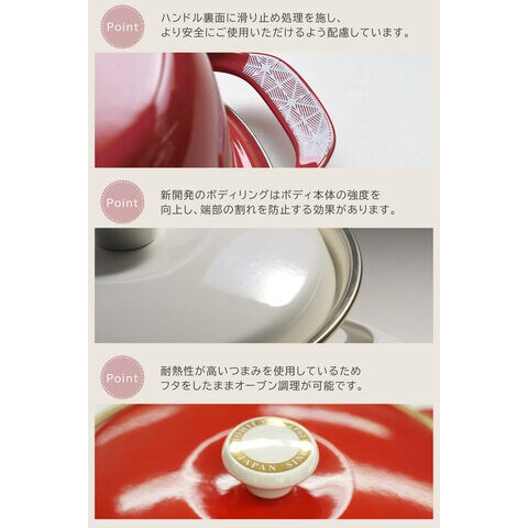 ・軽量で熱ムラのない加熱調理が出来る22cm両手鍋 ・業界初の1.8mmほうろう用鋼板を採用 ・持ち手は滑り止め加工を施してあるため、持ち運びの際も安心 ・割れを防止するために、全体の強度を向上させたボディリングを新開発 ・耐熱性の高いつまみを使用しているため、そのままオーブン調理が可能 |