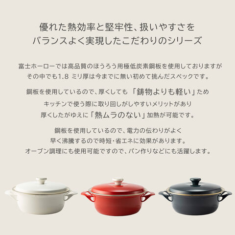 60余年ホーローに取り組んでいる富士ホーローグループ。 豊かな経験、実績が培ったノウハウと最新のテクノロジーによりさらに優れた特性を持つホーロー製品を開発しています。近年では、朝の情報番組内の料理コーナーで使用され、可愛らしいフォルムと軽量で使いやすいという口コミのもと人気急上昇中の老舗ホーローブランドです。