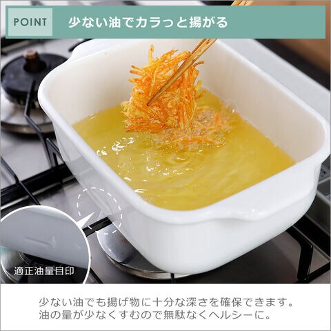 ・少ない油で揚げ物ができるワイドサイズの天ぷら鍋 ・角にピッタリフィットして食材をしっかりすくえる「角型フライヤーネット」付きセット ・長い食材も調理しやすい四角いカタチ ・優れた熱効率で仕上がりはカラッと ・油の状態がわかりやすい白い本体 ・油切り用のスノコ網、オーブン皿としても使えるバット付 ・付属品は本体と重ねてコンパクトに収納可 ・油汚れもすっきりと洗い落とせる琺瑯製 |