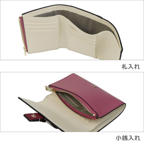 ・複数のカード入れ、収納を備えた三つ折り財布 ・質感の異なるレザーとカラフルなパーツがアクセント |