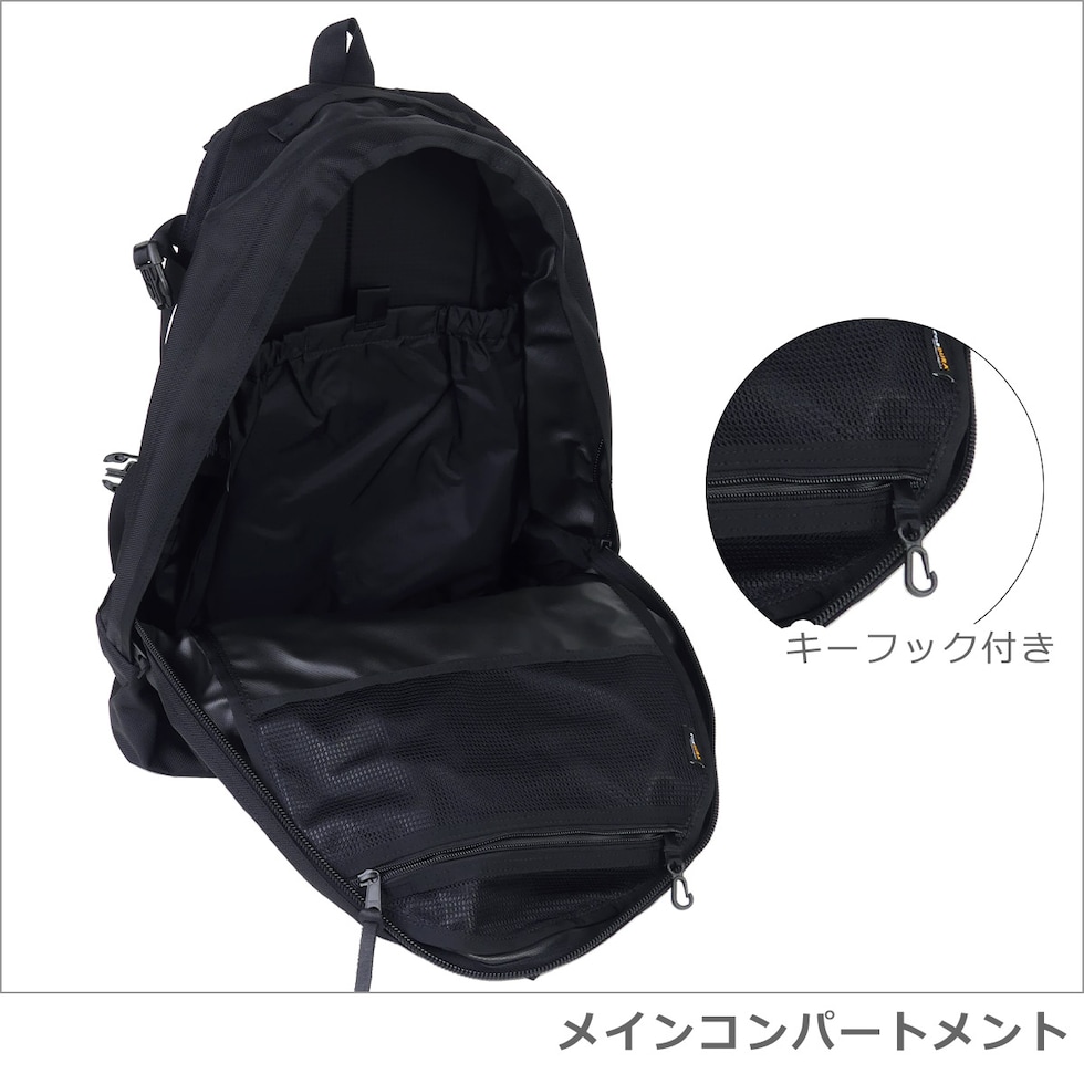 ・両サイドにコンプレッションバンドを装備 ・ボトム部にバックル付きラッシュストラップ、アイスアックス/トレッキングポール用ループを配備 ・大きめで持ちやすいレザータブ付きYKKジッパー ・メインコンパートメントはダブルファスナー開閉 ・コンパートメント内、大きめのオープンポケットx1、メッシュ製ジップポケットx1(キークリップx1)を配置 ・ウエストストラップ、チェストストラップ、トップハンドル付き。ウエストベルトの端が邪魔にならず仕舞えるベルトキーパー付き |