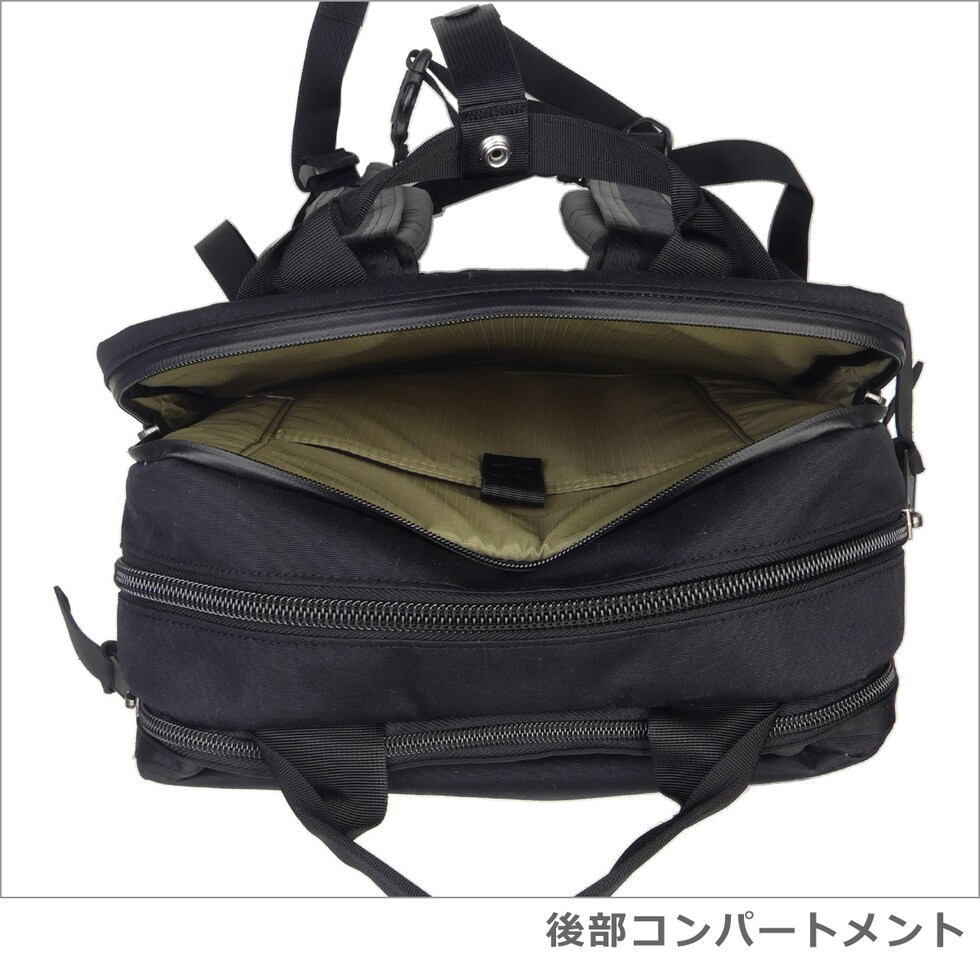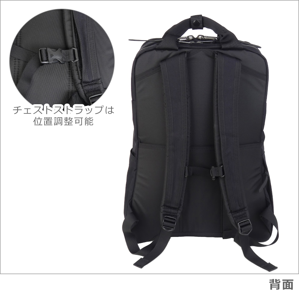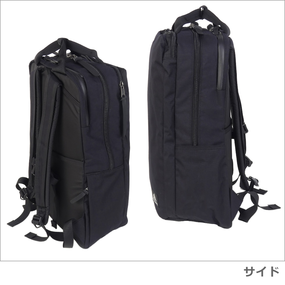 ・前面上部にジップポケット×1(オープンポケットx1、オープンメッシュポケット×2、ペンホルダー×2、キークリップ×1) ・メインコンパートメント(ダブルファスナー開閉/メッシュジップポケット×1、オープンポケット×2) ・後部コンパートメント/PC用コンパートメント(ダブルファスナー開閉(止水ファスナー)/タブレット用スリーブ×1) ・片側サイドにボトルポケット×1(アクティブシールドライニング使用/底部に水抜き機能付き) ・片側サイドの背面側にジップポケット×1 ・キャリーハンドルに取り付け可能なセットアップスリーブ付き ・長さ調節可能なショルダーハーネス(チェストストラップ付き) ・トップハンドル×2(持ち手を纏められるボタンホック付き) |