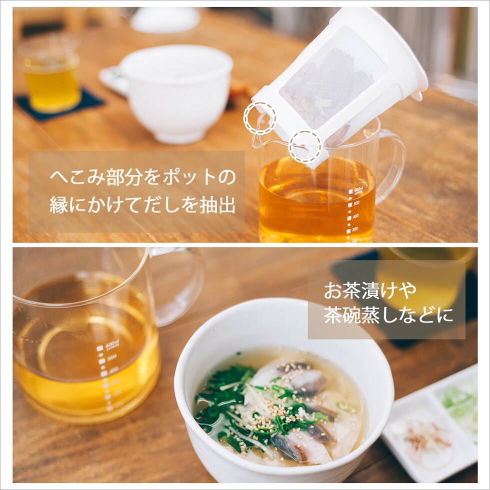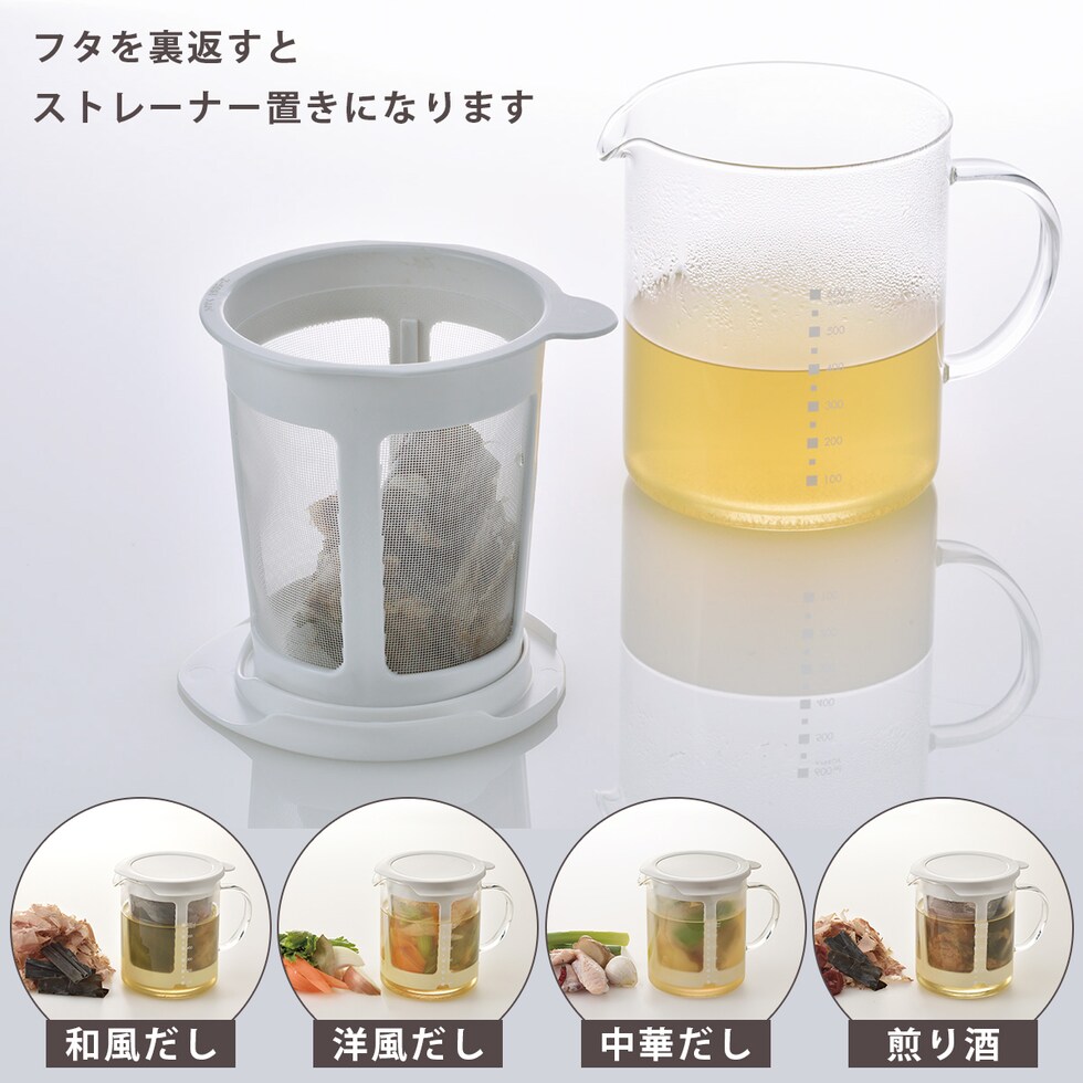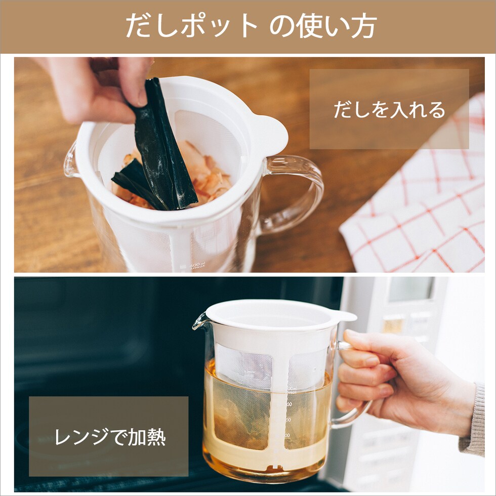・電子レンジで手軽に出汁が取れるポット ・ポットの底まで届く大きなストレーナーで出汁をしっかり抽出 ・ストレーナーのへこみ部をポットの縁に引っ掛けて最後の一滴まで抽出します ・フタは裏返すとストレーナー置きになります ・口が広くて洗いやすい仕様 |