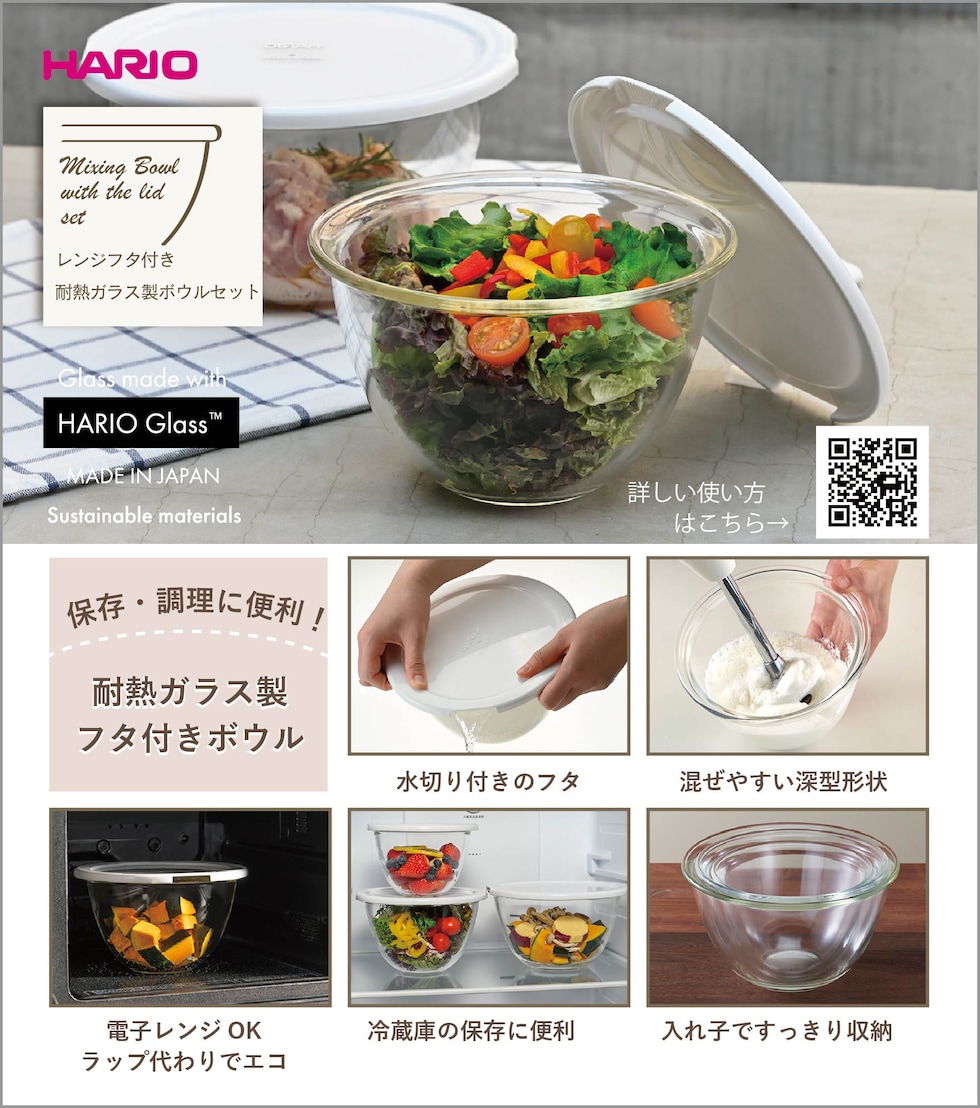 ・耐熱ガラス製ボウルと樹脂製フタのセット