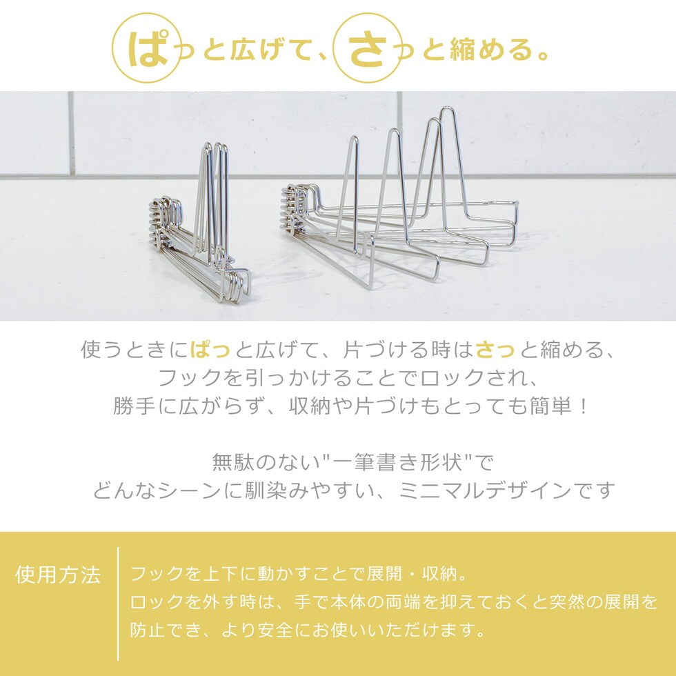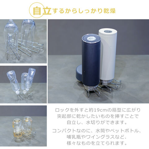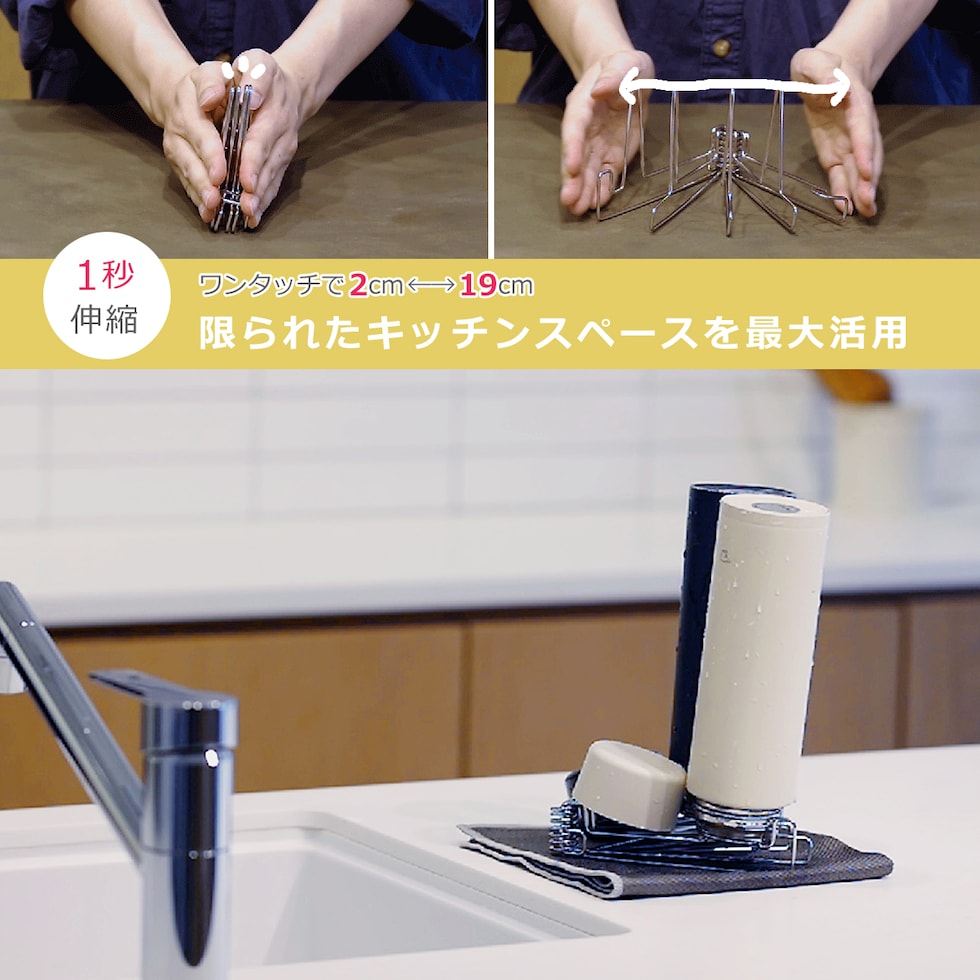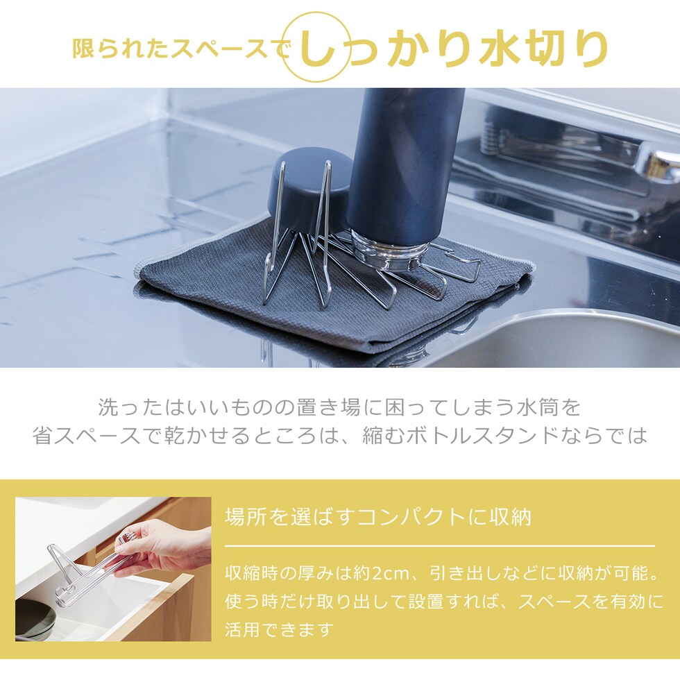 ・ワンタッチで瞬時に出来る超コンパクトなボトルスタンド ・置き場に困ってしまう水筒を省スペースで乾かせる ・使いたい時にぱっと広げて、片づける時はさっと縮めるだけ ・収縮時の厚みはわずか2cm。置き場所に困らず引き出しにも収納可能 ・丈夫な上に錆びにくい、自動車部品などに使われるステンレスのばね材を使用 ・手洗いはもちろんのこと食洗機で丸洗いOK |