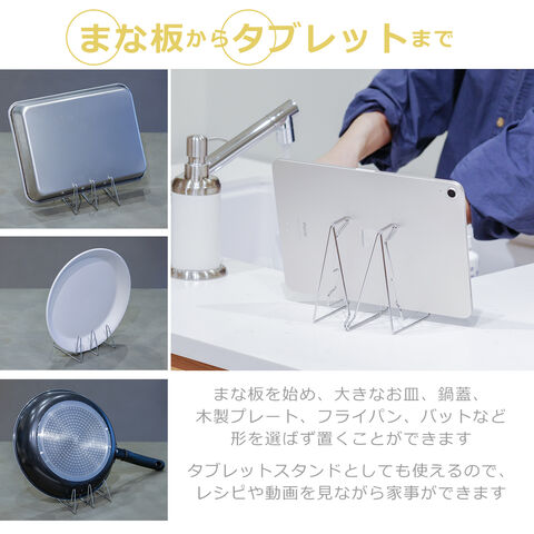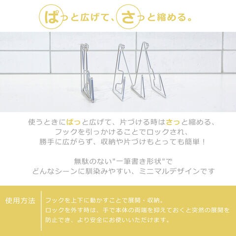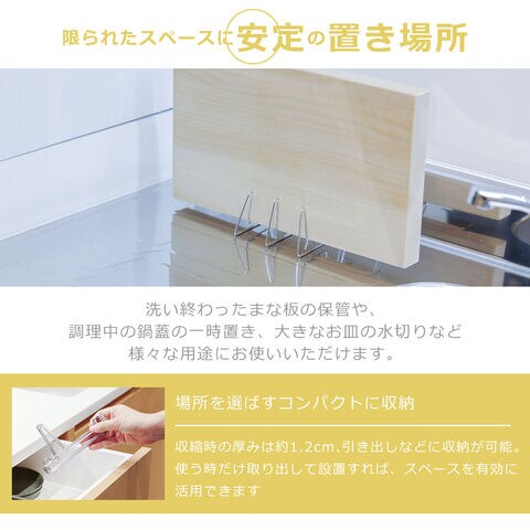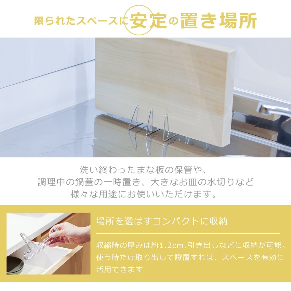 ・ワンタッチで瞬時に出来る、超スリムなまな板スタンド ・使いたい時にぱっと広げて、片づける時はさっと縮めるだけ ・大物でもしっかり支えられるのに、使う時もしまう時も場所を取らない ・まな板はもちろん、調理中の鍋蓋の一時置き、大きなお皿の水切りなど様々な用途に活躍 ・収縮時の厚みはわずか1.2cm。置き場所に困らず引き出しにも収納可能 ・丈夫な上に錆びにくい、自動車部品などに使われるステンレスのばね材を使用 ・手洗いはもちろんのこと食洗機で丸洗いOK |