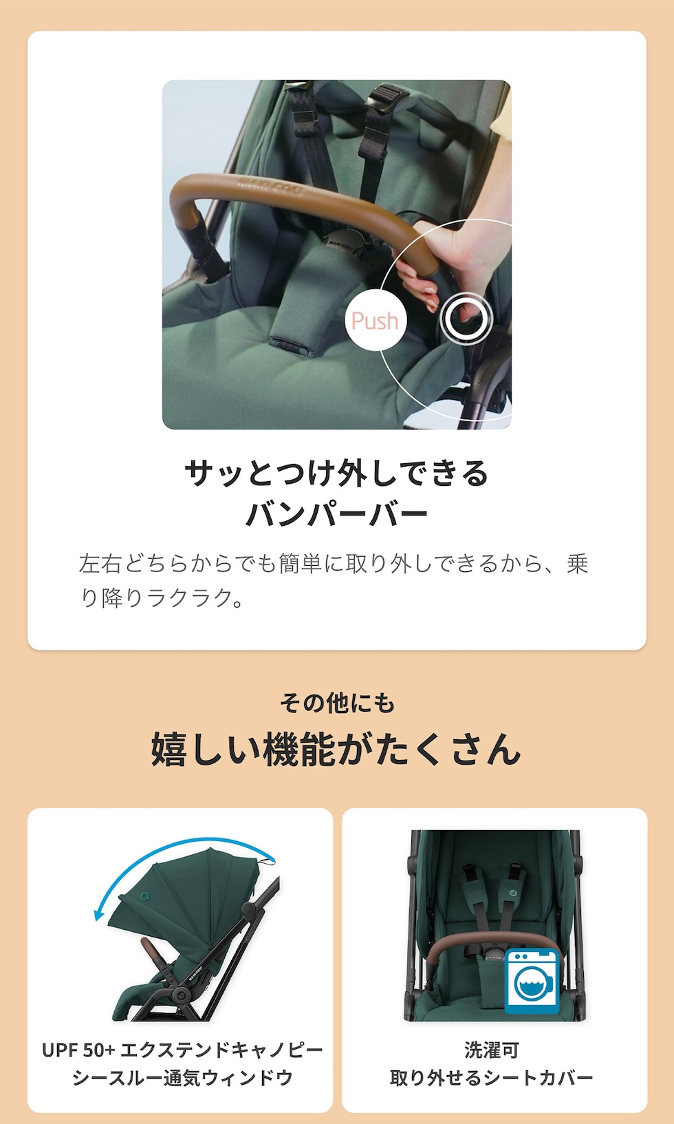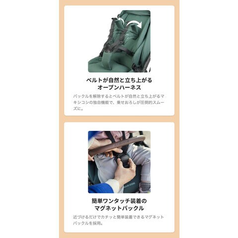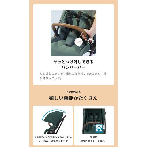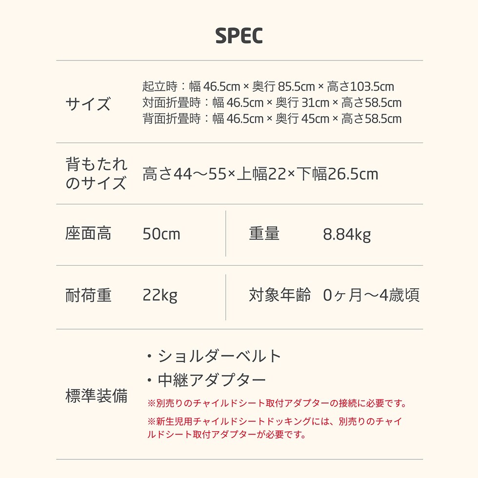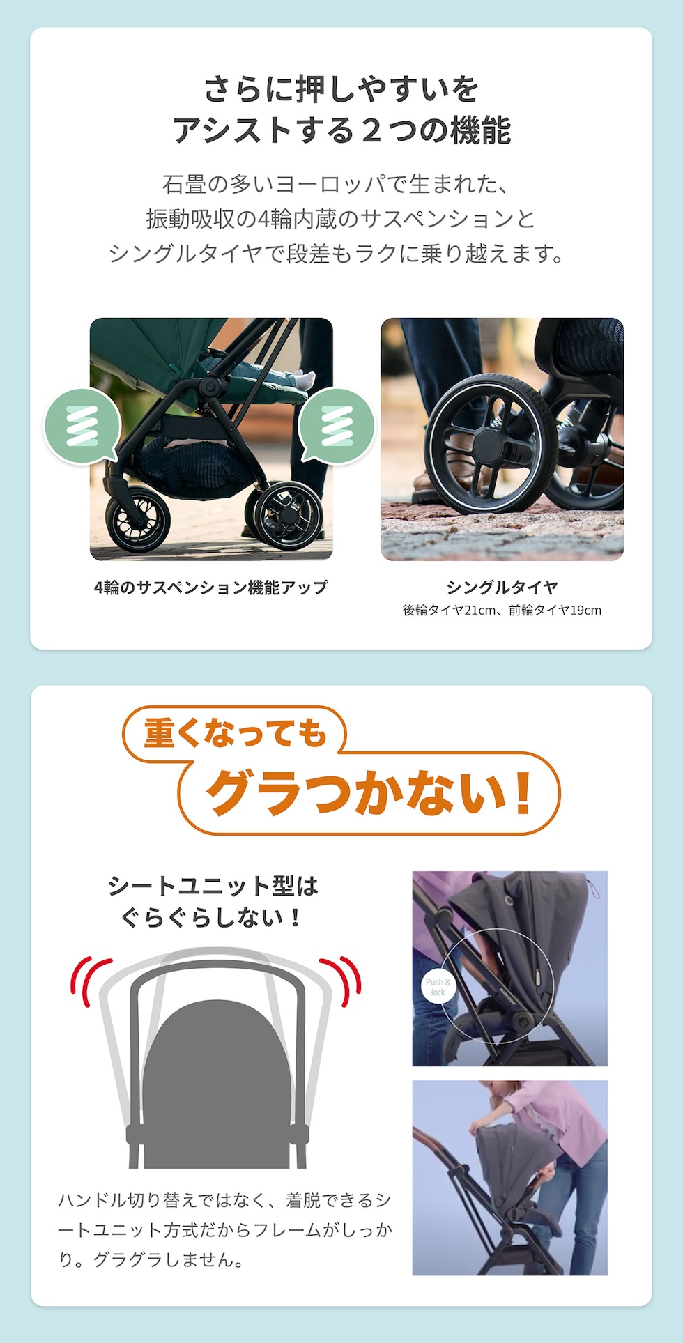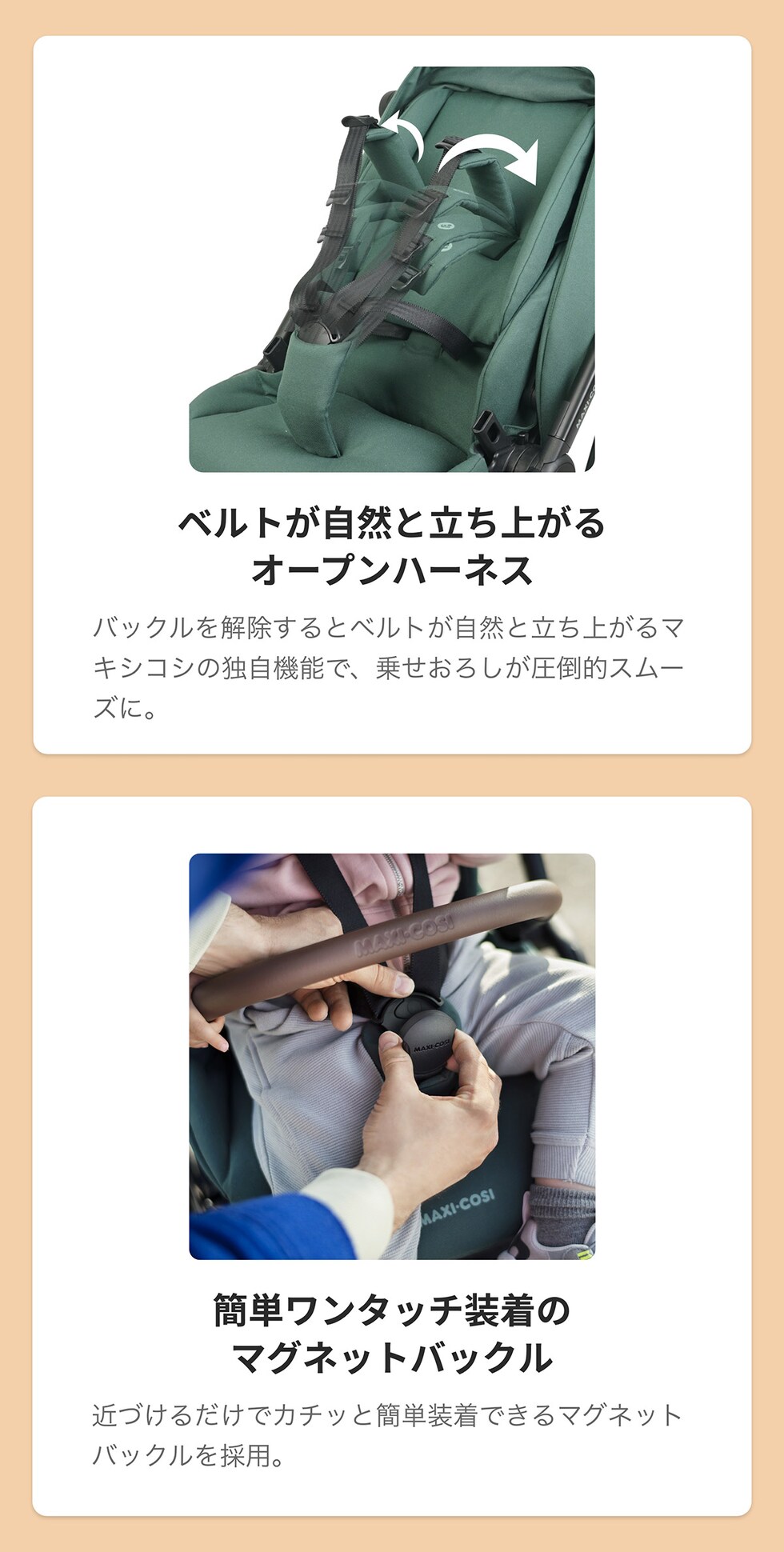 ・シートを切り替えることで向きを変えることができる、両対面式ベビーカー ・ベルトと本体カラーが同色のツイリックシリーズ ・対面、背面どちらでもコンパクトに折り畳みが可能 ・お子さまの成長に合わせて、背もたれの高さを3段階で調節可能な「アジャスタブルバックレスト」 ・お子さまが成長してもぐらつきにくい、しっかりとしたフレームのシートユニット型 ・重くなっても押しやすい、力が伝わりやすいストレートフレームとアシストフレーム ・乗せたり降ろしたりがもしやすい、オープンハーネス・マグネットバックル仕様 ・振動吸収に優れた4輪独立サスペンション付き ・段差が楽に乗り越えられるシングルタイヤ |
