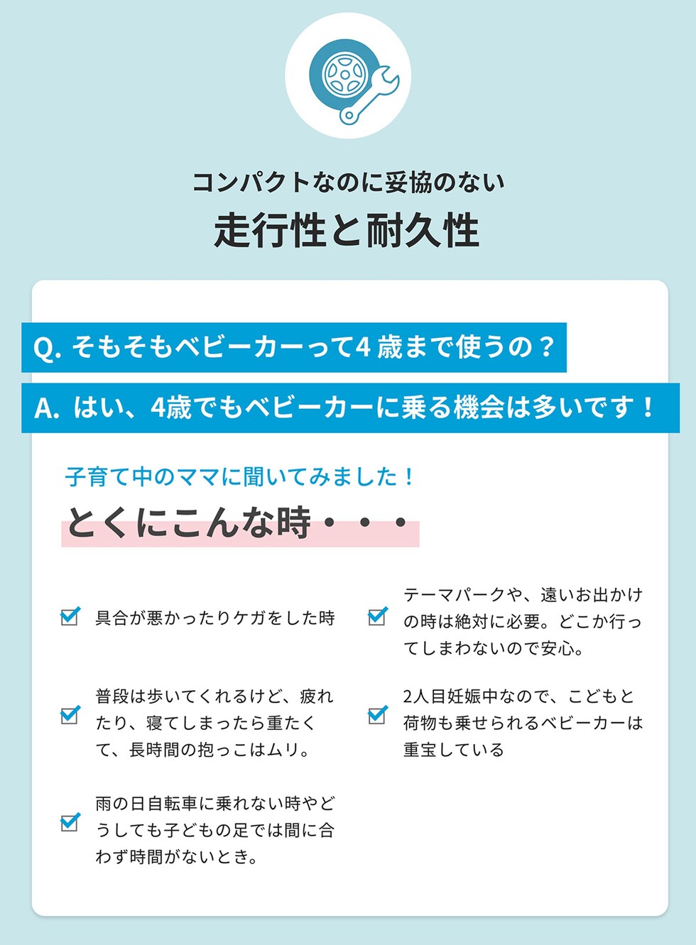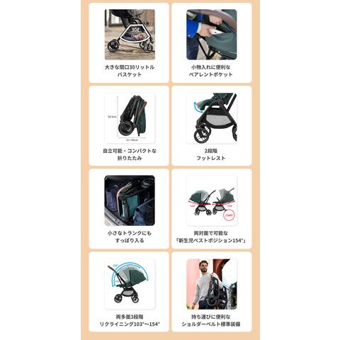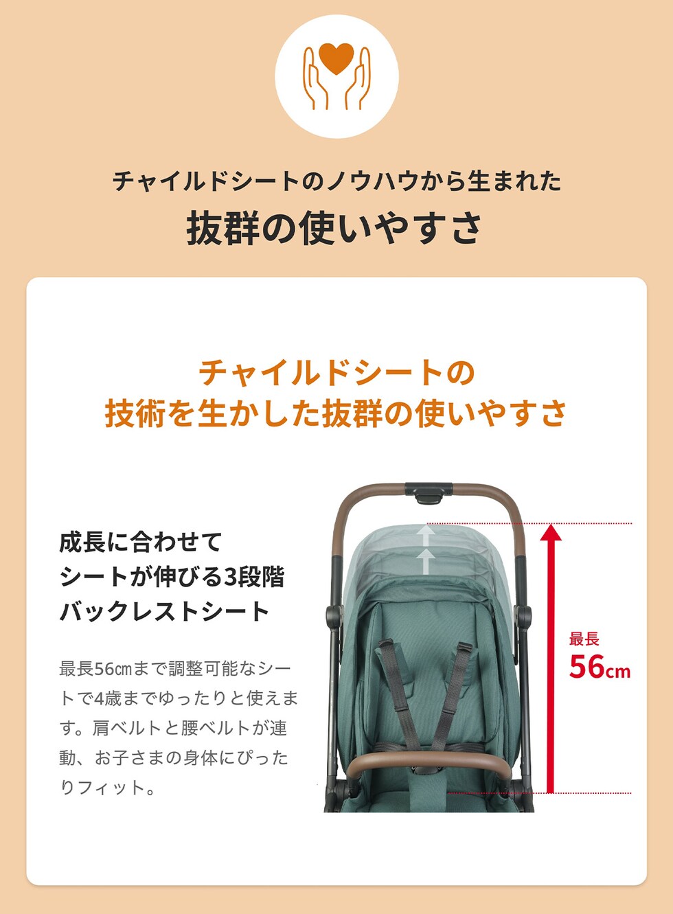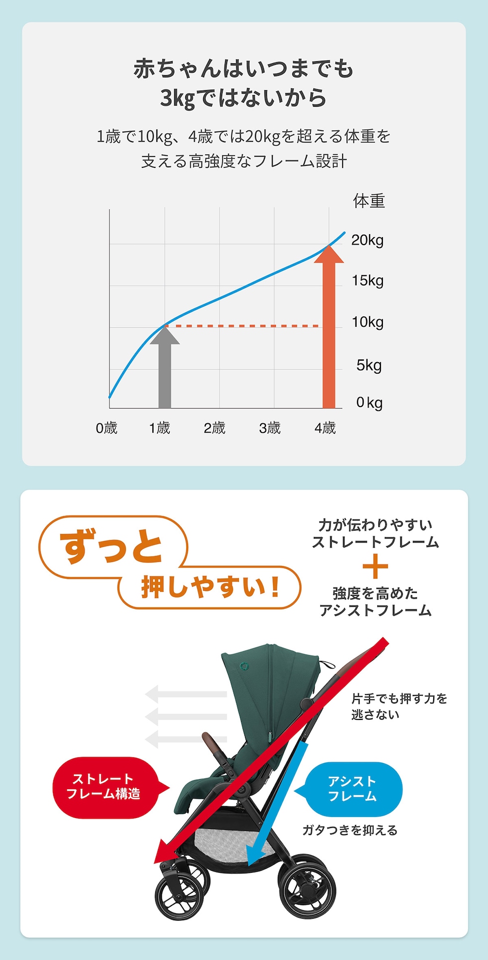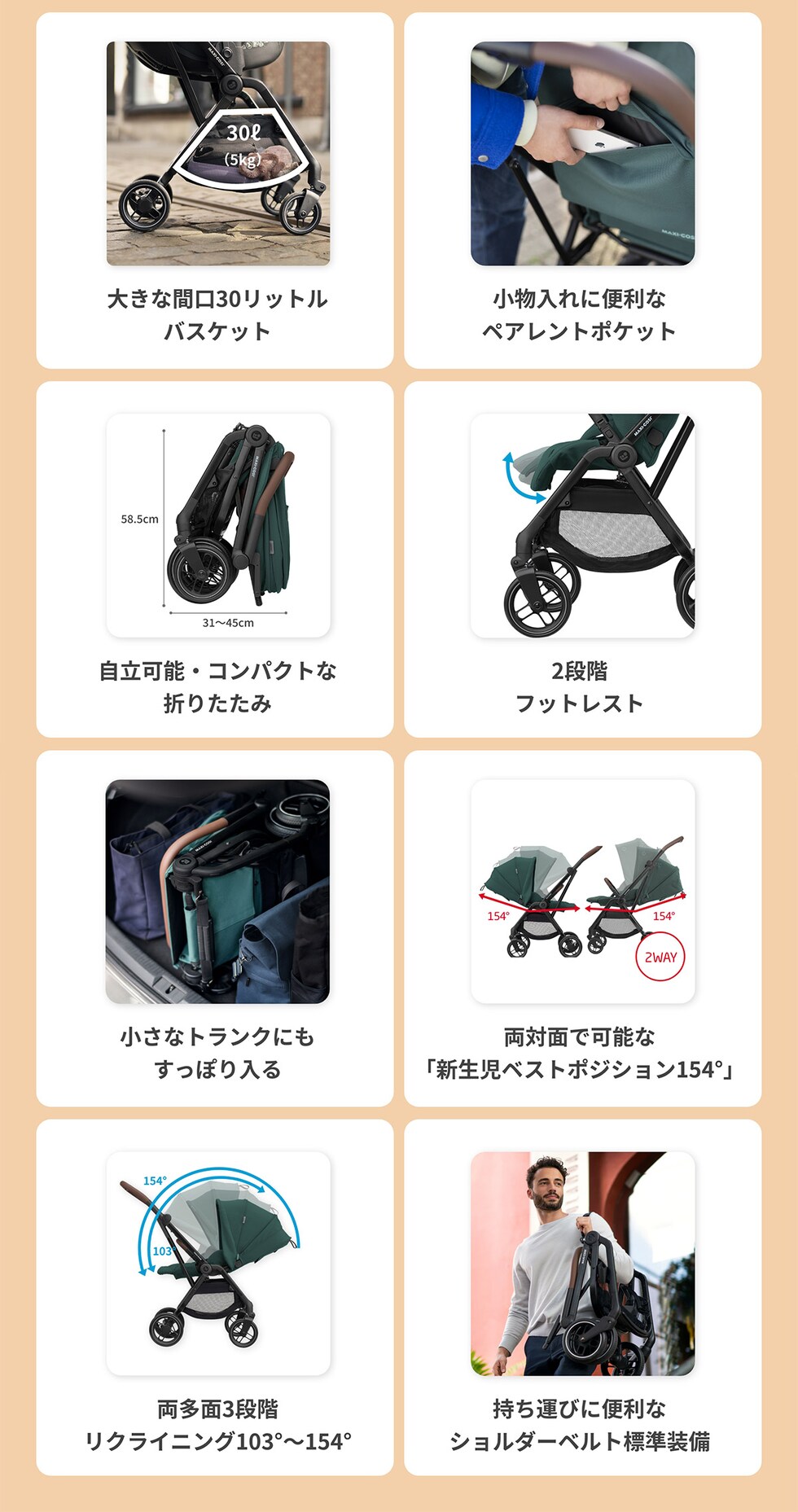 ・シートを切り替えることで向きを変えることができる、両対面式ベビーカー ・ベルトと本体カラーが同色のツイリックシリーズ ・対面、背面どちらでもコンパクトに折り畳みが可能 ・お子さまの成長に合わせて、背もたれの高さを3段階で調節可能な「アジャスタブルバックレスト」 ・お子さまが成長してもぐらつきにくい、しっかりとしたフレームのシートユニット型 ・重くなっても押しやすい、力が伝わりやすいストレートフレームとアシストフレーム ・乗せたり降ろしたりがもしやすい、オープンハーネス・マグネットバックル仕様 ・振動吸収に優れた4輪独立サスペンション付き ・段差が楽に乗り越えられるシングルタイヤ |