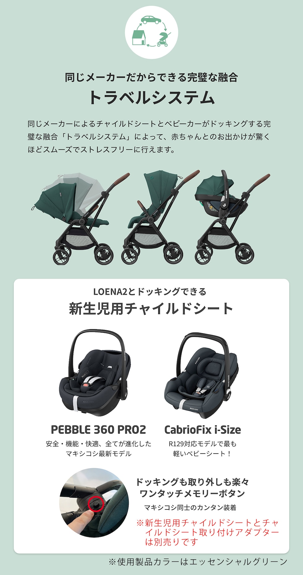 ※トラベルシステムには対象の乳児用チャイルドシートとカーシートアダプターが別途必要になります ・対象年齢は目安になります ・商品のサイズやスペックは、ブランドまたはメーカーにより公開されたものを参考に表記しています ・商品仕様は予告無く変更となる場合がございます ・イメージ画像には、該当商品以外の撮影小物なども写っておりますが、それらの小物は商品には含まれません ・光・画面の設定により、カラーが実際の商品と若干異なることがございます |