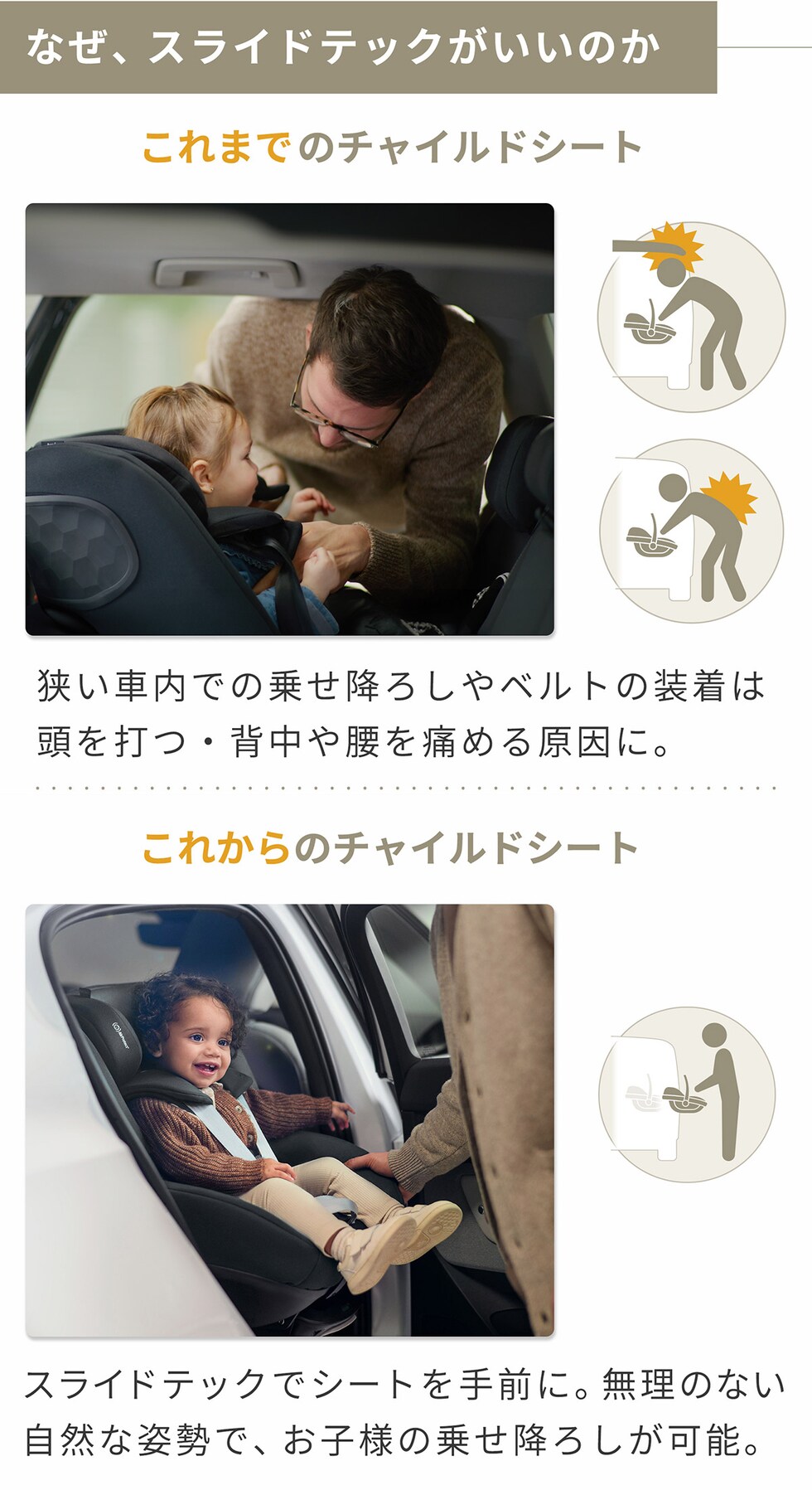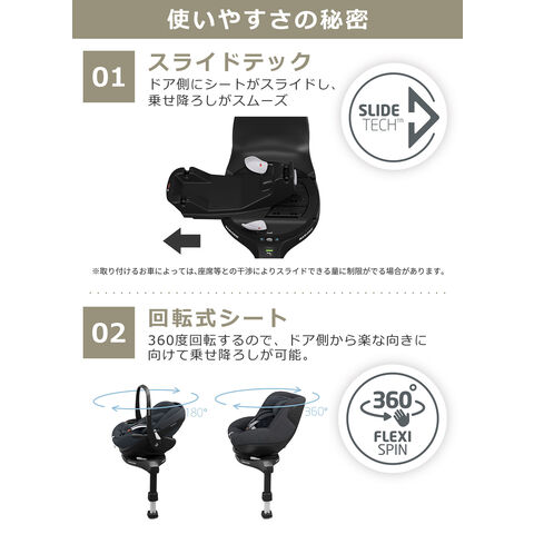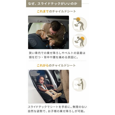 ・回転機能に加え、手前に引き出す「スライドテック」搭載で乗せ降ろしが楽々 ・シート側面のレバーで、片手で簡単に回転操作 ・シートとベースメントが分離するから、お手入れや他の車への乗り換えがスムーズ ・新生児期の早すぎる前向き使用を防ぐ、回転方向を制御できるレバーを装備 ・シートの着脱や回転、ISOFIX固定を正しく行われているかインジケーターで視覚的にお知らせ |