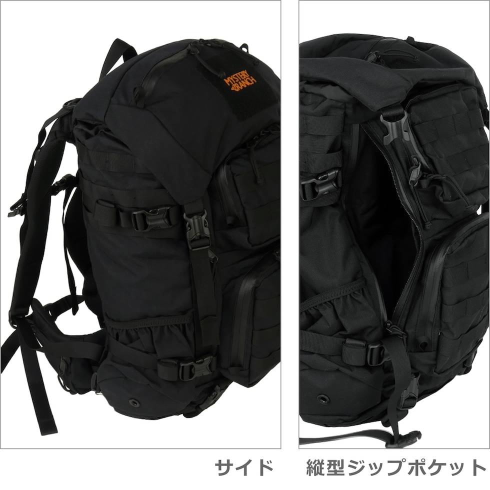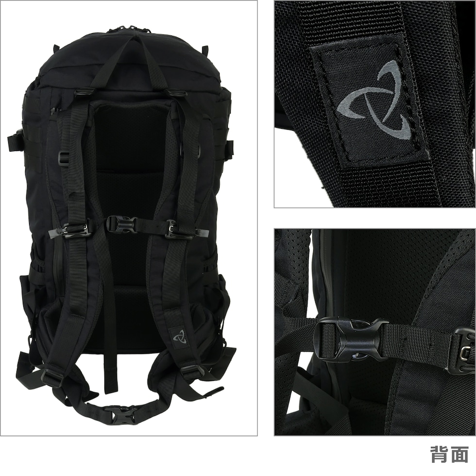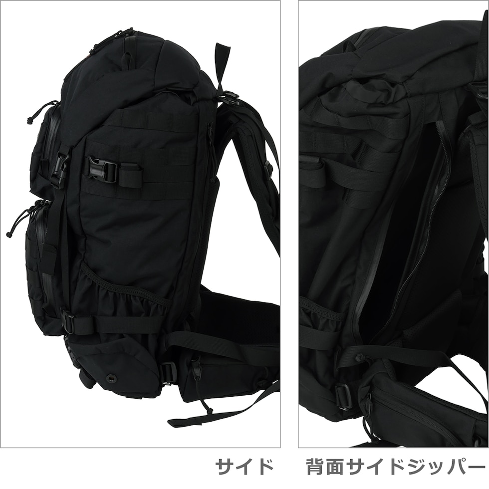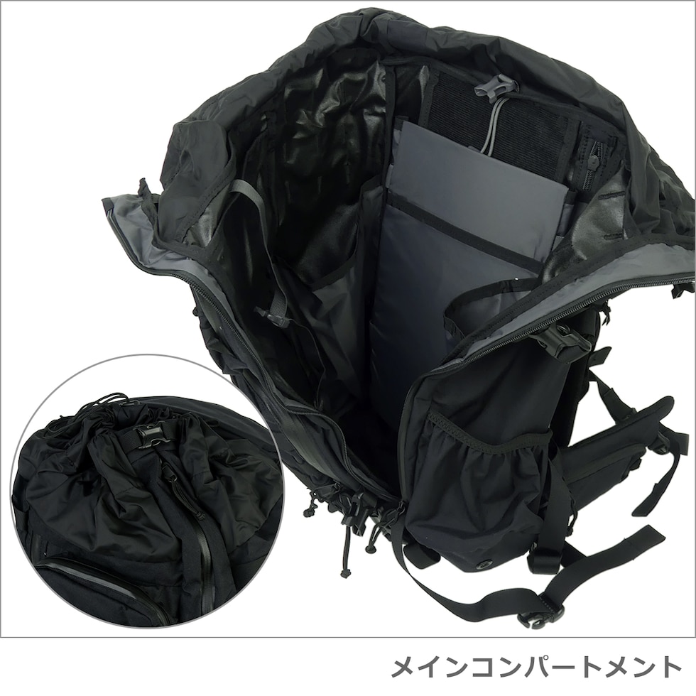・上部ポケット/トップリッドポケット×1(ダブルファスナー開閉) ・フロント、両サイド、ボトムにデイジーチェーンを装備 ・フロント上下に U字型ジップポケット×2(上:オープンポケット×2、キーフック×1 / 下:オープンポケット×2、ペンホルダー×2) ・フロント片側サイドにジップポケット×1 ・両サイド、ボトムにコンプレッションストラップ装備 ・トップにロゴ入りベロクロ付き ・両サイドにボトルポケット ・メインコンパートメント (絞り調整・バックル付き / オープンポケット×3、バックル付きストラプ、PC用スリーブ×1) ・背面のファスナーからメインコンパートメント(PC用スリーブ)にアクセス可能 ・長さ調節可能なショルダーハーネス(ロードリフトストラップ、上下の位置調節可能なチェストストラップ付き) ・取り外し・調節可能なウェストベルト ・ウエストベルトの左右にジップポケットを装備 ・調整可能なヨーク |