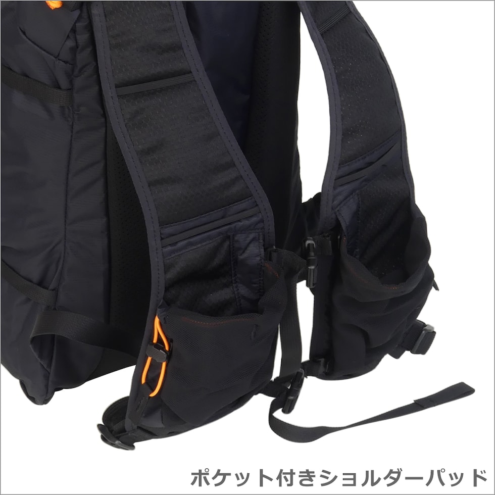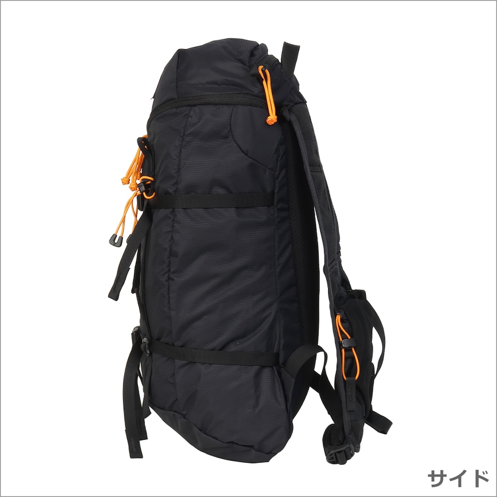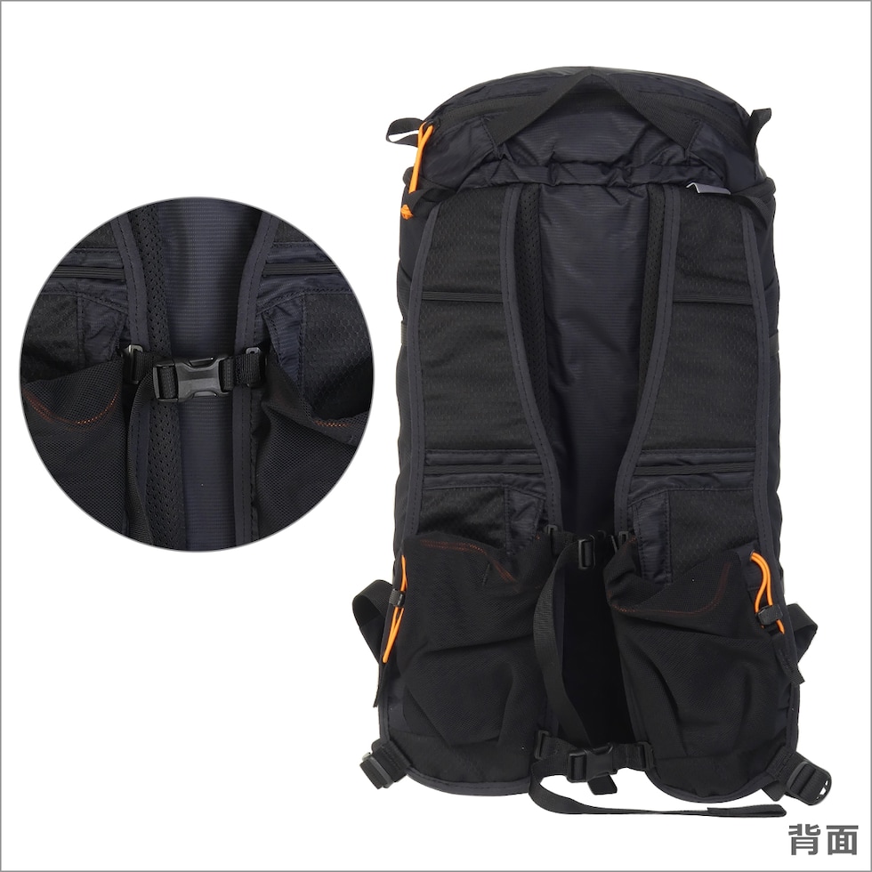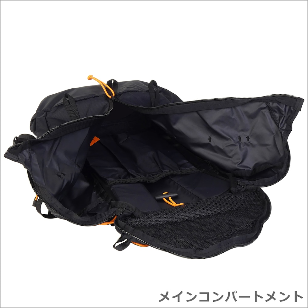 ・トップにジップポケット(キーフック×1) ・メインコンパートメント(ジップ開閉(3ジップデザイン) / オープンポケット×1) ・バックル付きコンプレッションストラップ×2 ・長さ調節可能なショルダーストラップ(上下の位置調節可能なチェストストラップ付き) ・左右のショルダーパッドにポケット×各1 ・上部にトップハンドル |