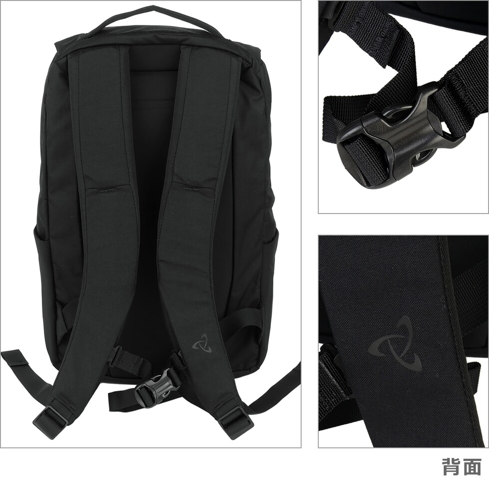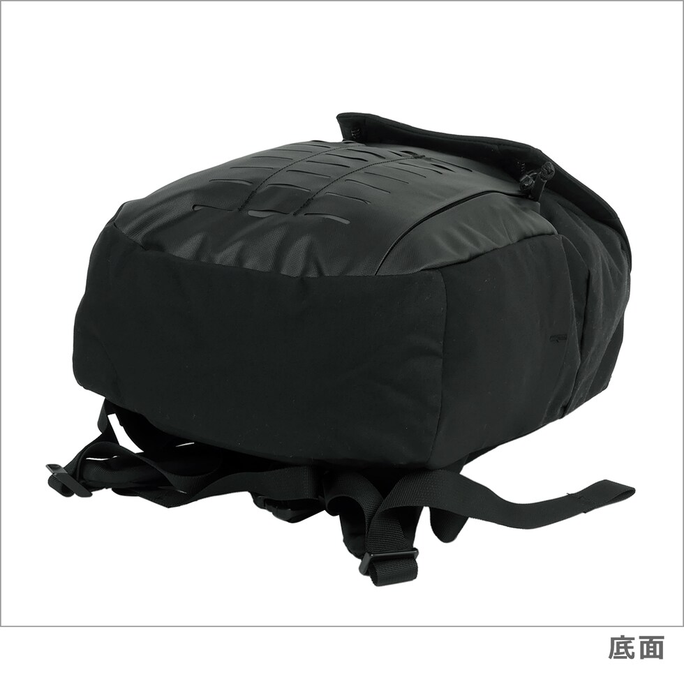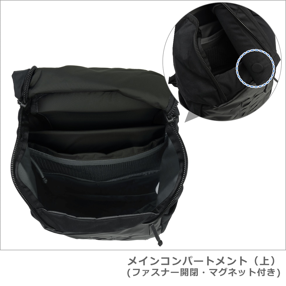 ・前面にジップポケット×1 ・フロントにレーザーカットMOLLEパネルを装備 ・メインコンパートメント(ファスナー開閉・マグネット付き /オープンポケット×2、ジップメッシュポケット×1、 PC用ソフト保護ポケット×1、タブレット用保護スリーブ×1) ・両サイドにストレッチ素材のボトルポケットを装備 ・長さ調節可能なショルダーストラップ(上下の位置調節可能なチェストストラップ付き) ・上部にトップハンドル |