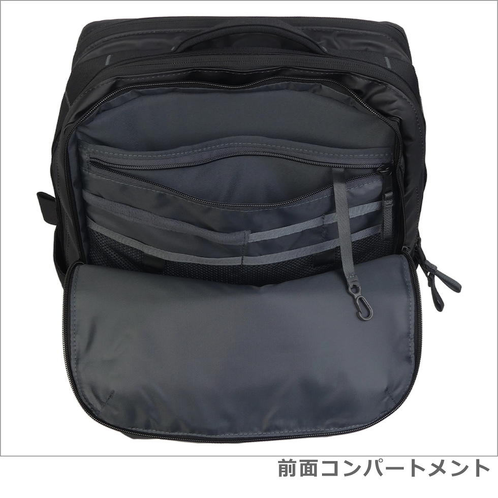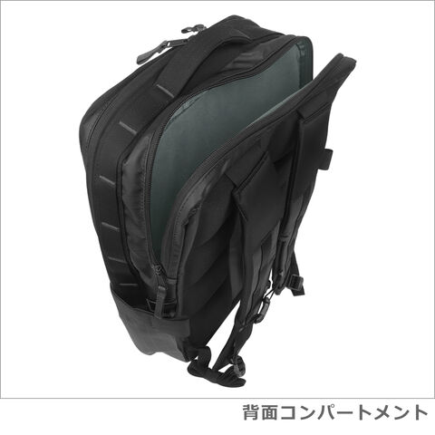 ・前面ジップポケット(裏地はフリース素材) ・前部コンパートメント(ファスナー開閉 / ジップポケット×1、オープンポケット×4、カードポケット×1、ペンホルダー×1、キーフック×1) ・メインコンパートメント(ファスナー開閉 / メッシュジップポケット×1) ・後部コンパートメント / PCスリーブ(ダブルファスナー開閉) ・両サイドにオープンポケット×各1 ・サイド・トップ・ショルダーハーネスにデイジーチェーンを装備 ・長さ調節可能なショルダーハーネス(上下の位置調節可能なチェストストラップ付き) ・トップハンドル ・各所に反射材パーツ |