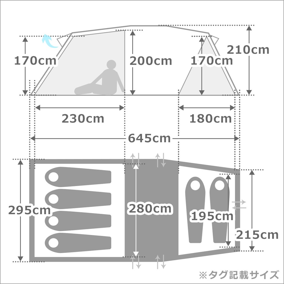 | (奥行き x 幅 x 高さ) ・フライシート:645 x 295 x 210cm ・インナーテント1:230 x 280 x 200cm ・インナーテント2:280 x 160 x 170cm |