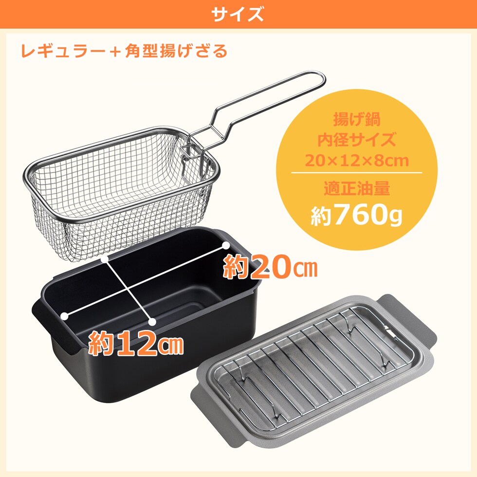 レギュラー:約 245 × 140 × 90mm(内径:約200 × 120mm) 角型揚げざる:約340 × 110 × 120mm(内寸:180 × 95 mm) |