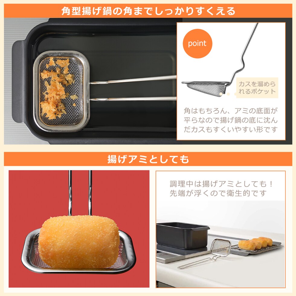 ・角型揚げ鍋の角まですくえるカス揚げ ・アミの底面が平らになっているため、しっかりすくえる形状 ・コンパクトですくいやすい ・揚げアミとしても |